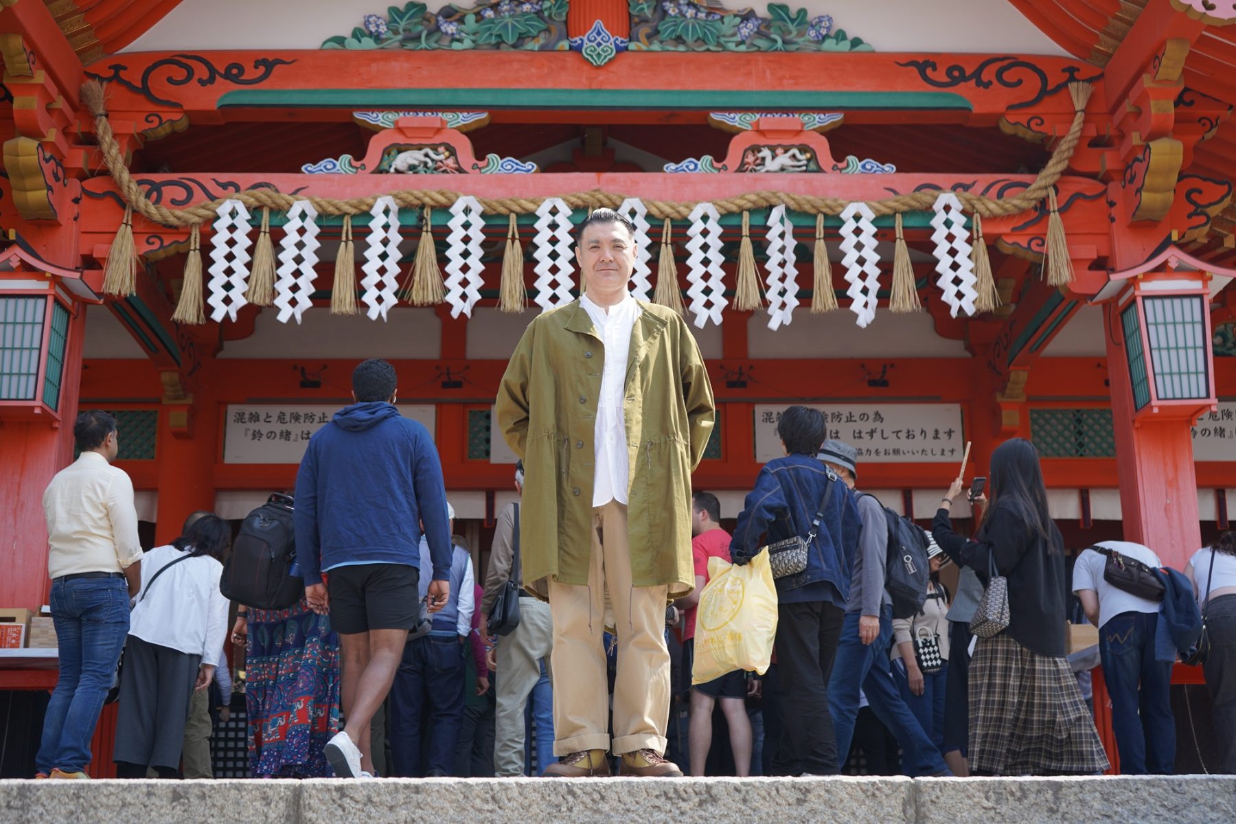 京阪電車・伏見稲荷駅を出て東へ約5分歩くと、伏見稲荷大社に到着。気候の良い季節ということもあって、多くの参詣者で賑わう中、織太夫さんはまず本殿へお参りをされました。「こちらは全国に3万社あるともいわれる稲荷神社の総本宮なのですよ」