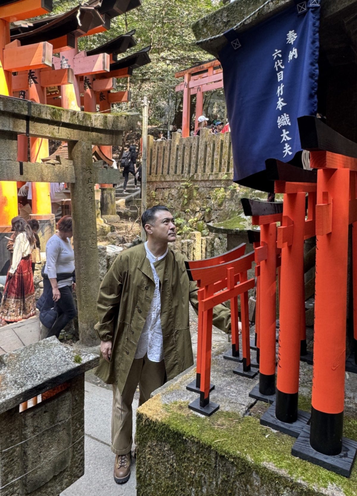 伏見稲荷大社境内には、織太夫さんにとって重要な場所があります。それは本殿に最も近い最大の石宮(お塚)である「織太夫稲荷」です。「襲名披露公演を終えた4か月後に、豪雨災害で石鳥居が倒壊したと聞いた時は、当代として縁を感じました」。織太夫稲荷はかつてあった人形浄瑠璃の劇場、堀江座の座主をつとめた木津谷吉兵衛が明治44(1911)年に創設。当時名乗っていた「四代目竹本織太夫」の名が石宮の正面に刻まれています。