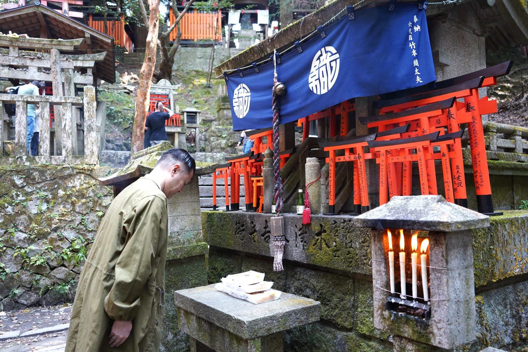 織太夫さんが和ろうそくを灯して、中揚げをお供えして、お参りをされていると、大勢の外国からの参詣者が集まって来ました。手を合わせる方の姿も見られ、言葉はわからなくても信仰の思いは伝わるのだと感じました。