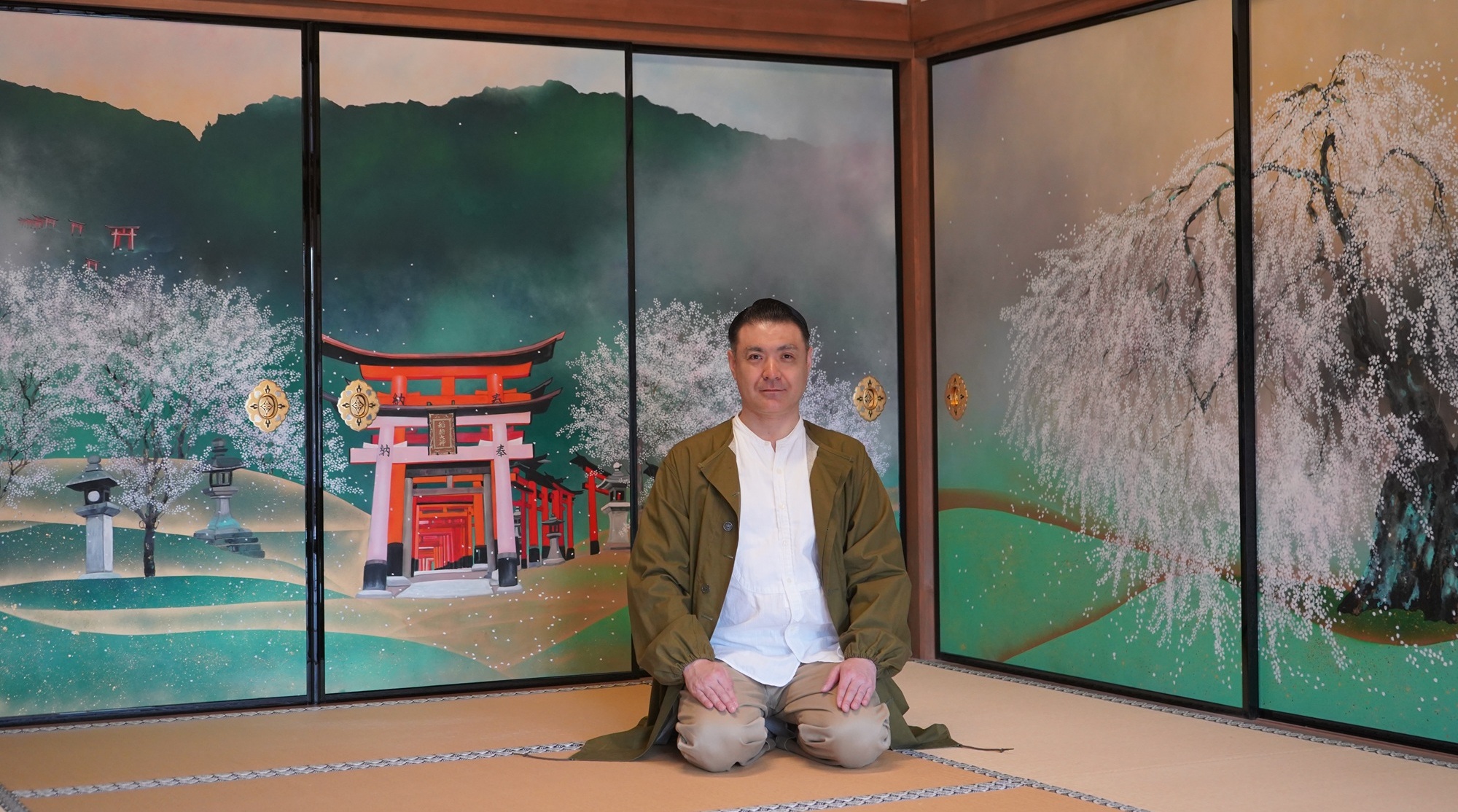 取材の日は、伏見稲荷大社のご厚意で、社務所のなかを案内していただきました。4月は国立文楽劇場で『義経千本桜』の通し公演に織太夫さんは出演されますが、ちょうどその世界観にぴったりな美しい襖絵を拝見して、目を奪われました。浜田泰介(はまだたいすけ)画伯の作で、春宵(右側)稲荷山の春(正面)行く春(左側)のタイトルがつけられています。