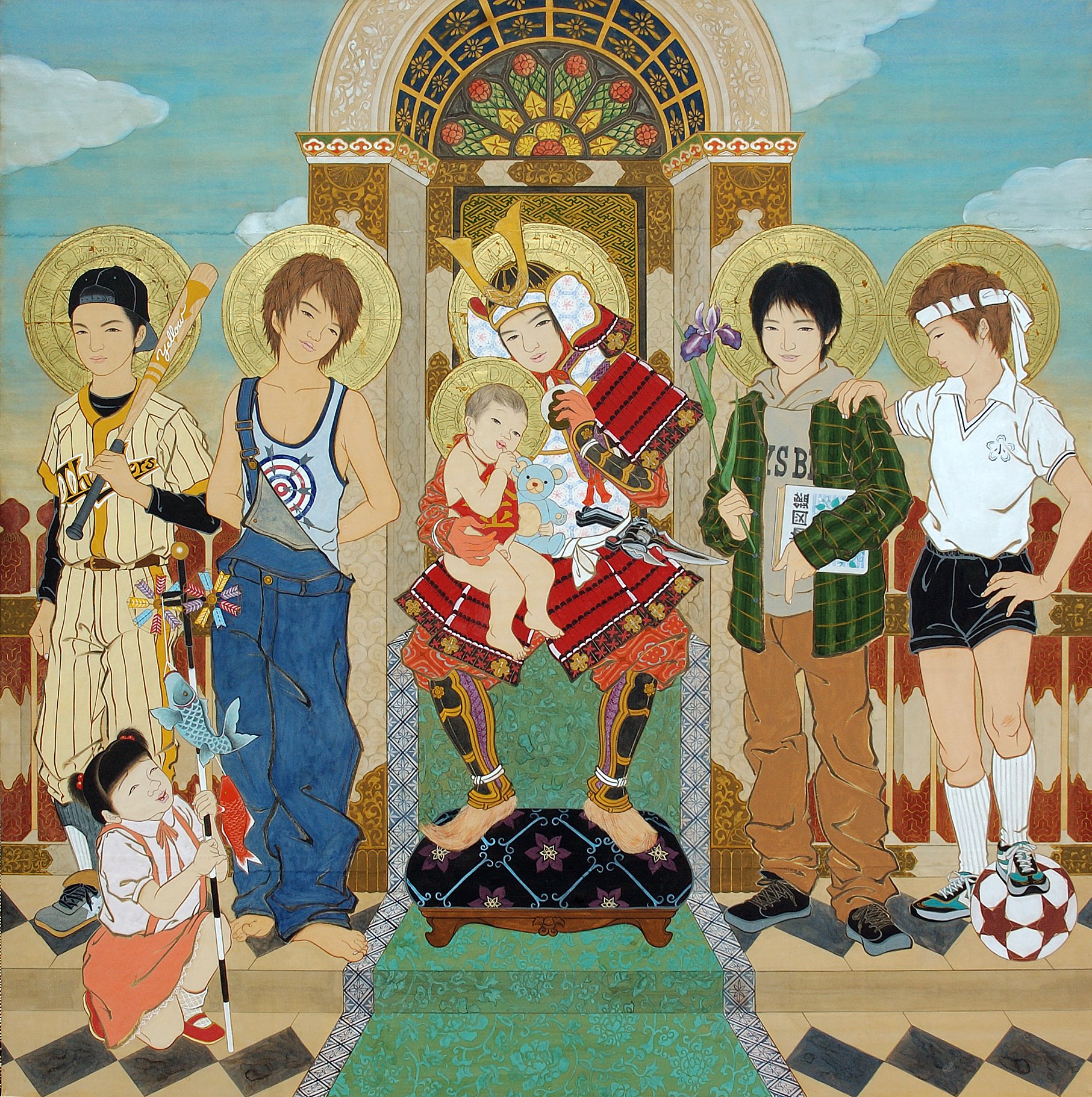 ちなみに私は「少年」はあまり描いてないのですが、イケメンを描き始めた頃、某少年アイドルグループに感銘を受け、宗教画風に《Boys Be! 少年の節句》という絵を描きました。現代の若衆、稚児たちですね。真ん中の兜の男の子、毛抜きで月代抜いてないといいなぁ。