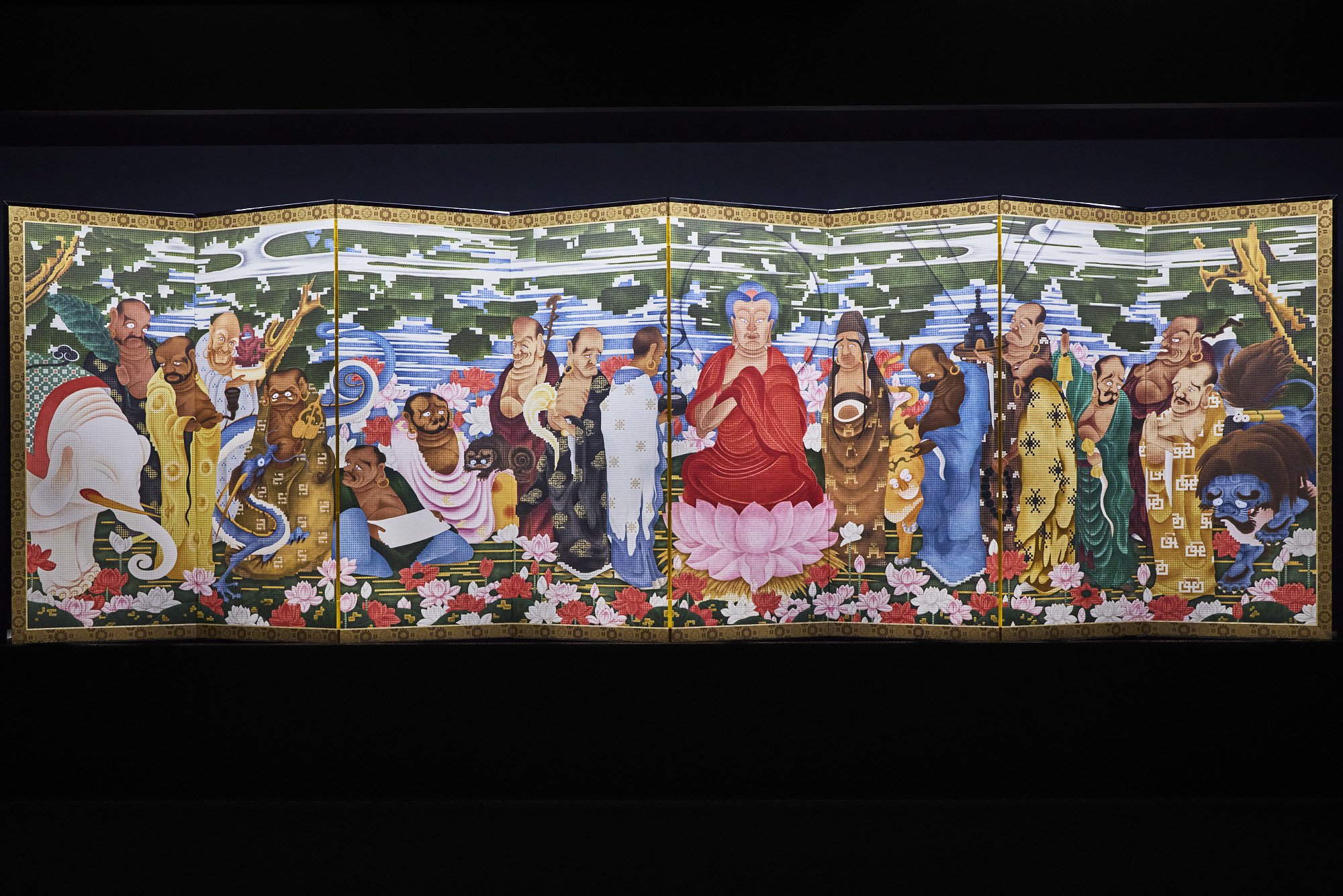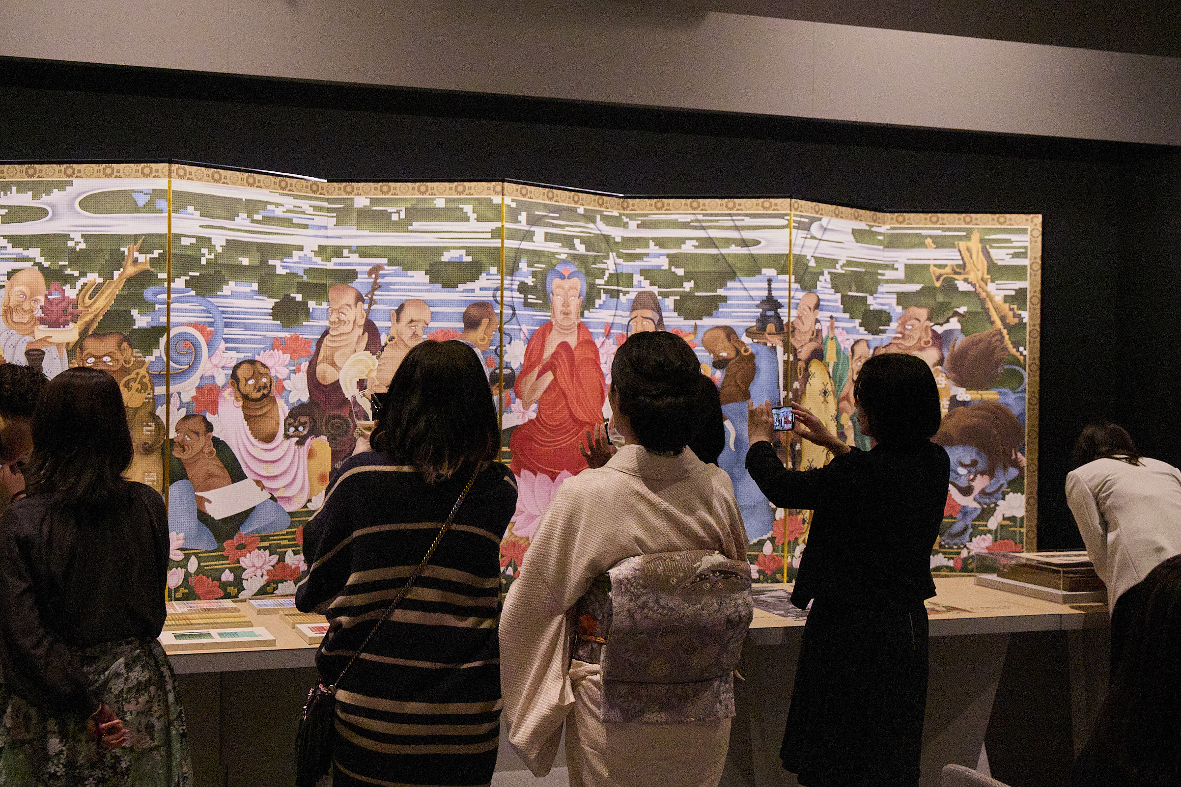19時からのメインイベントでは、TOPPANが最新技術を駆使して開設した「デジタル文化財ミュージアム KOISHIKAWA XROSS®」に会場を移動。同所では、伊藤若冲の幻の大作「釈迦十六羅漢図屏風」のデジタル推定復元作品(写真下)が披露されました。