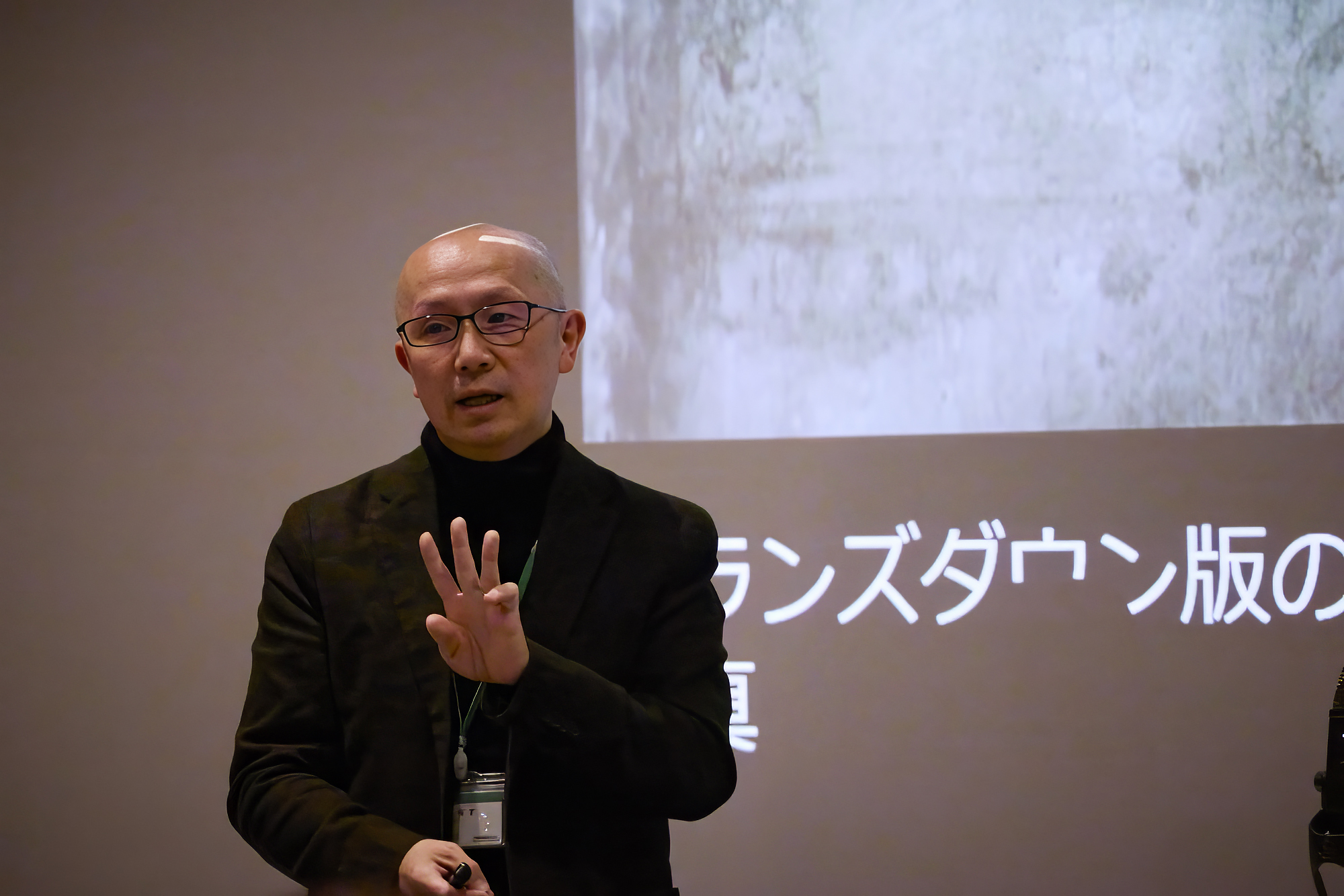 今回のイベントをさらに特別なものにしたのが、二人の著名な美術史家による講演とトークセッションでしょう。初めに登壇したのは、レオナルド・ダ・ヴィンチの作品復元プロジェクトなどにも携わる池上英洋氏(東京造形大学教授。写真下)。西洋美術と東洋美術、それぞれの復元の在り方や意義を比較しながら、デジタル技術がもたらす新しい美術作品復元の可能性について語りました。