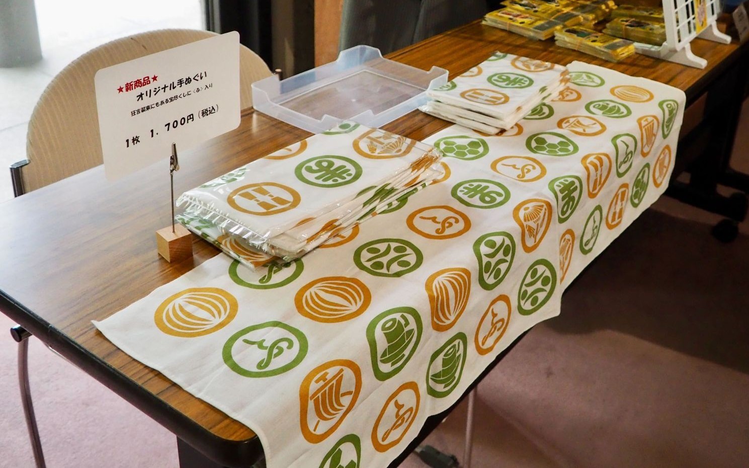 新作グッズとして、普段も使えそうなカラフルな手ぬぐいを販売。手ぬぐいを購入した人には舞台からファンサービス(手を振ったりすること)をすると万之丞さんがお知らせし、みなさんドキドキしながら購入していました。
