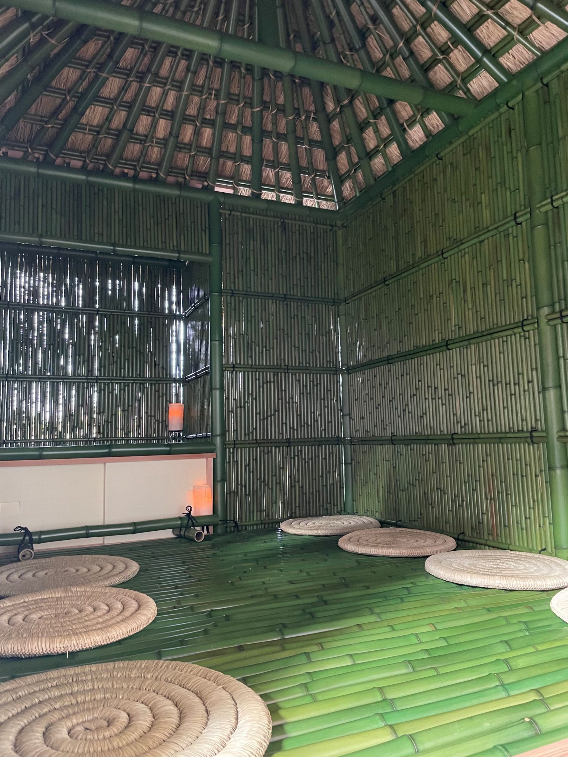 給湯流:床も壁も竹! 鮮やかなグリーンがまぶしい。 こんな茶室、初めて入りました。
