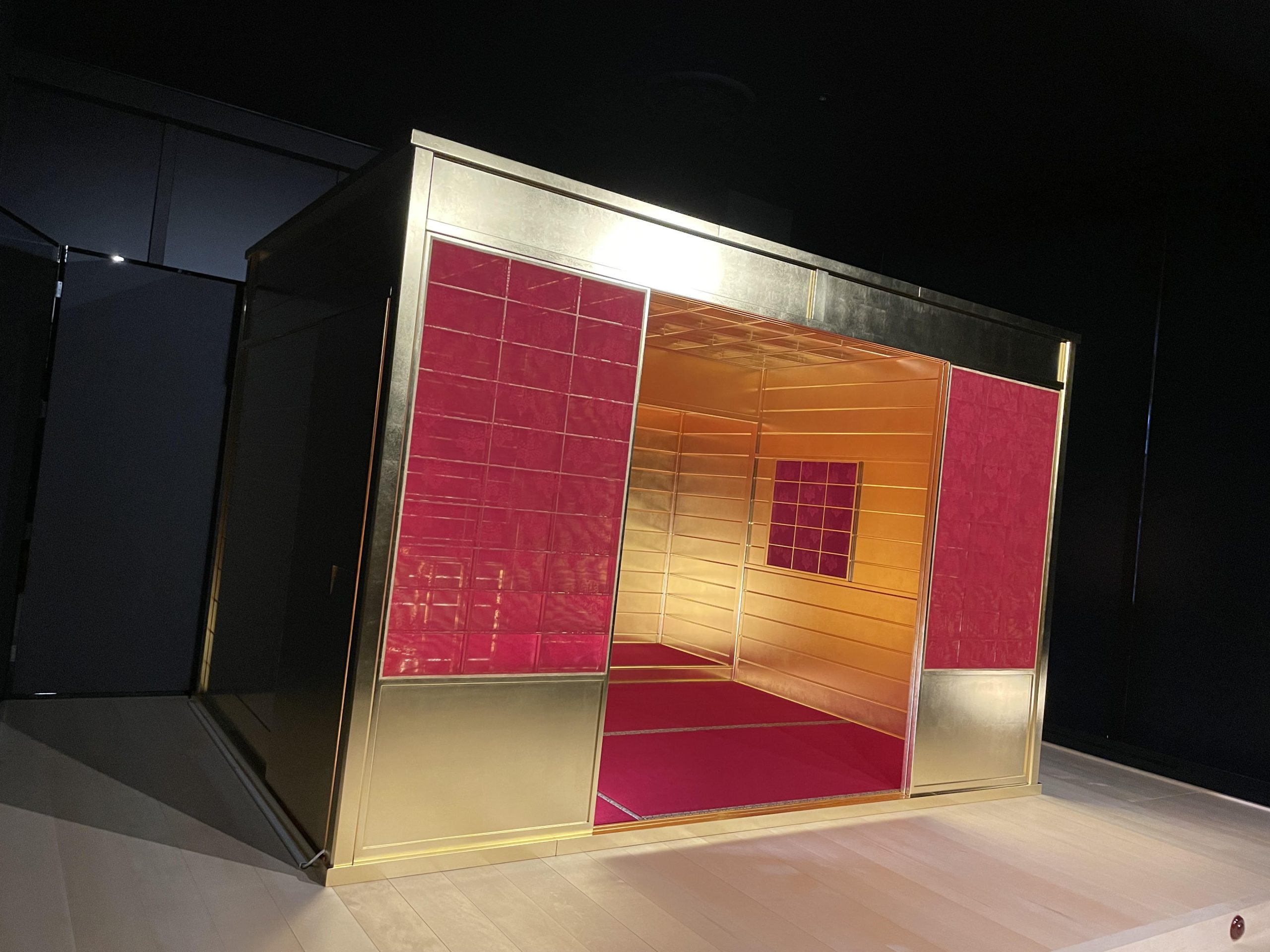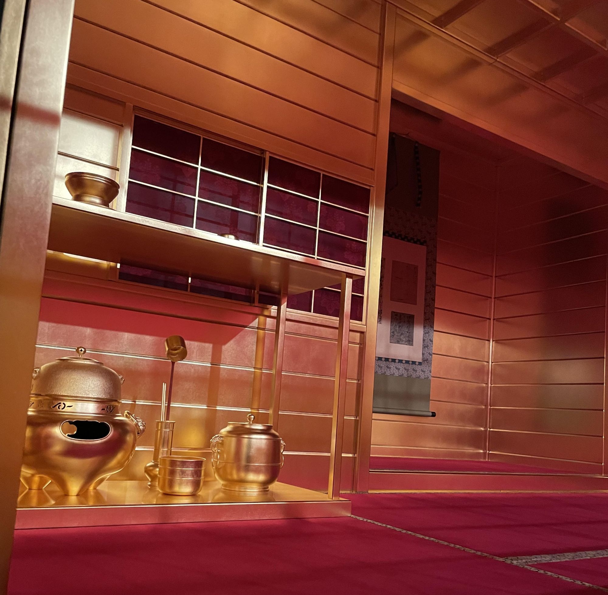 久野:「秀吉が千利休と対立した理由のひとつは、黄金の茶室」と思ってお越しになるお客様が多いです。でも実際の茶室には意外にも、暗く落ち着いた空間に柔らかい金の光が広がります。