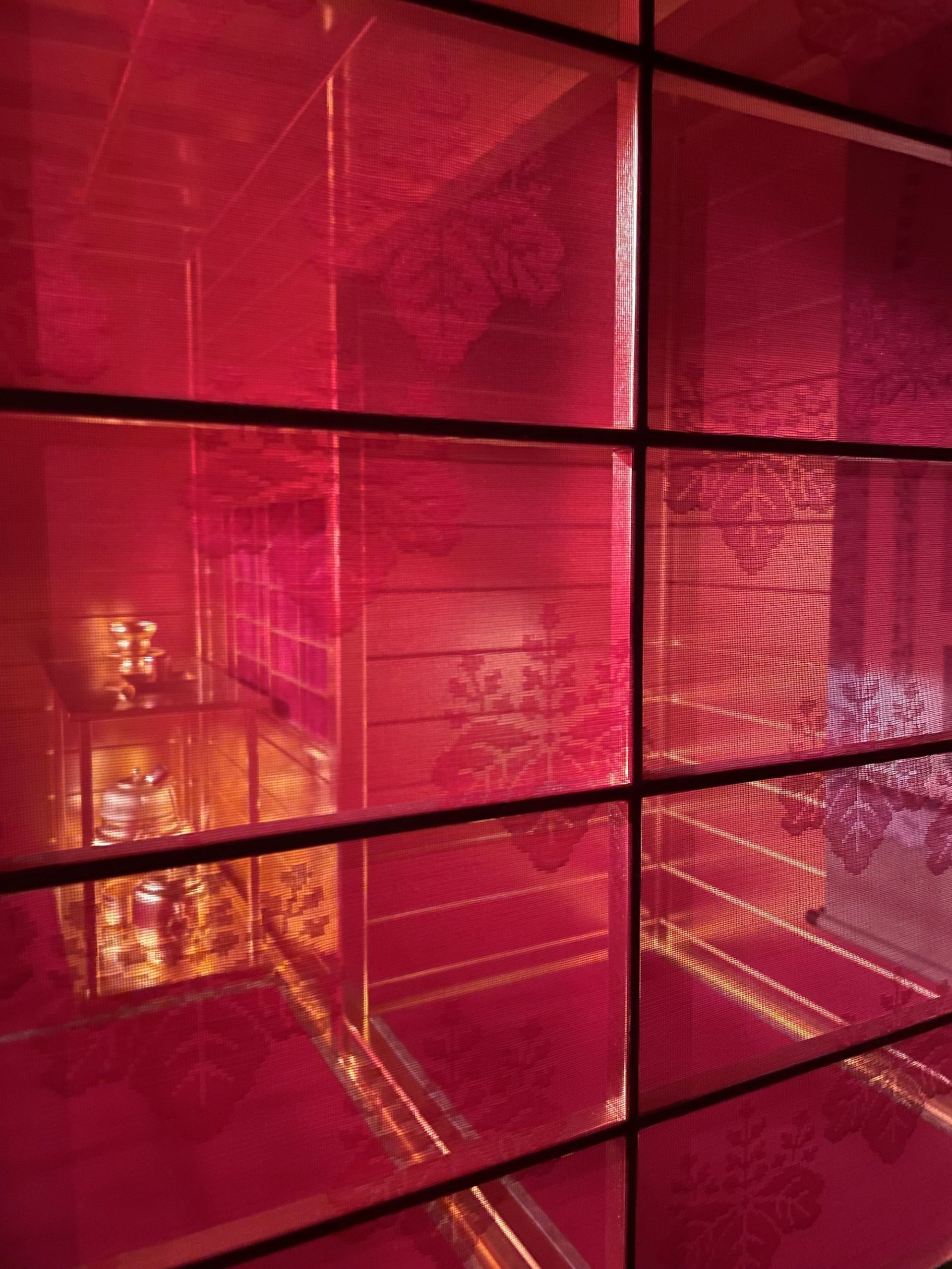 久野:博多の商人、神屋宗湛(かみやそうたん)が名護屋城で黄金の茶室に入ったときの日記によると、「赤く薄い絹に紋様が織り込まれている」と書いてあります。