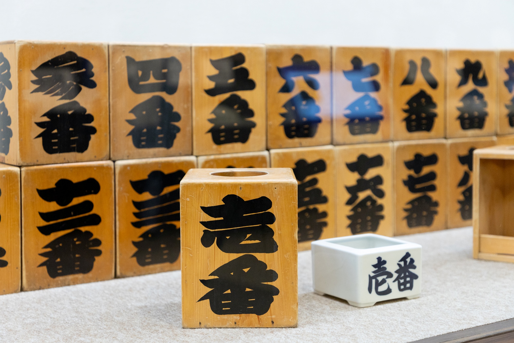 昔の横綱土俵入で締めた雲龍型と不知火型の”横綱”(土俵入で締める腰に締める綱も横綱という)展示されていますが、今と違ってやや小さめなのがわかります。100年という時代のなかで力士の身体も大きくなったことが展示品から伝わってきます。「モノや道具を展示すると今とさまざまな比較ができますね。平成16(2004)年までは枡席は喫煙ができました。そのため枡席には火箱と灰皿が置いてありました。それらも当時の相撲観戦の雰囲気を伝える道具として展示しています」と中村さん。
