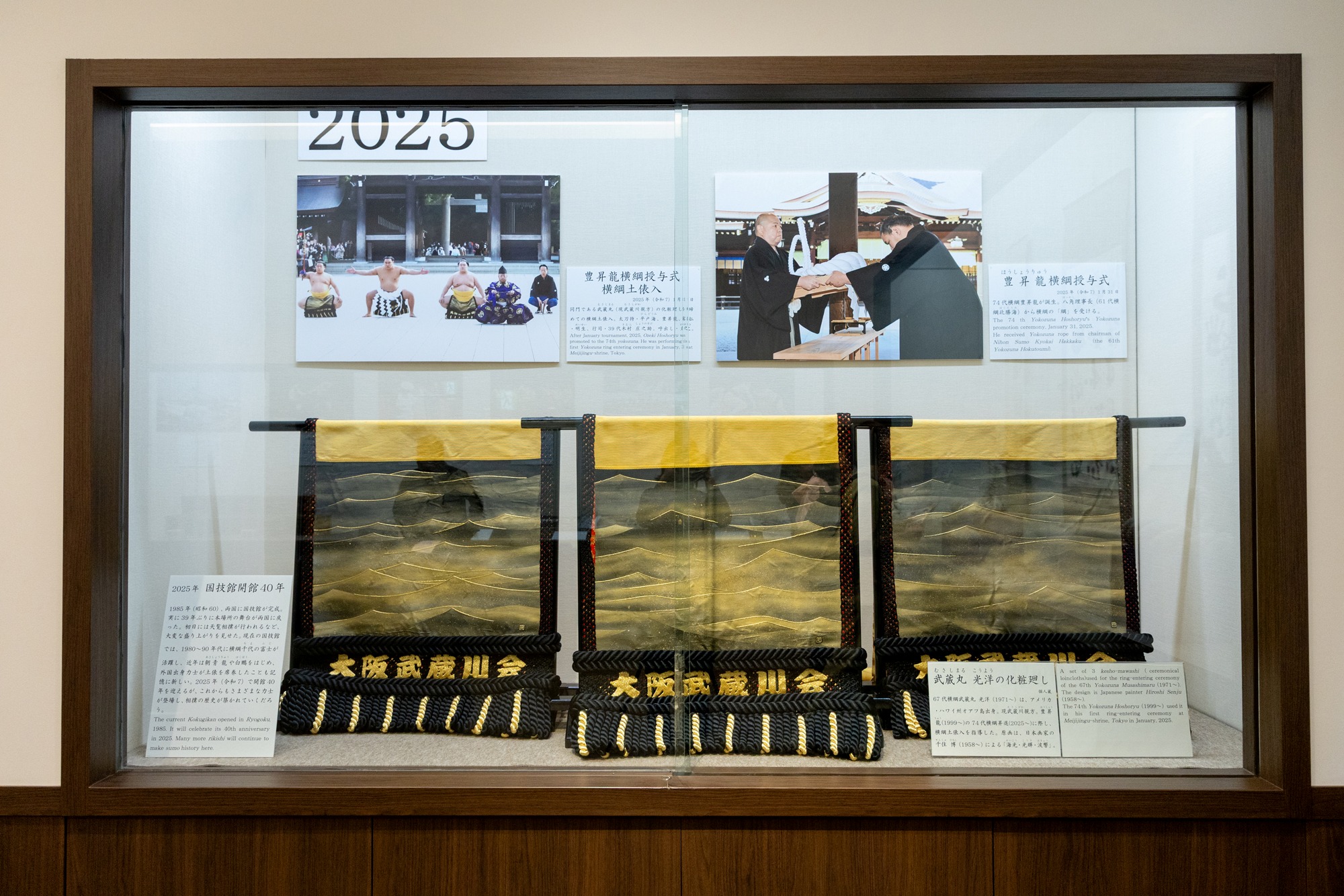 相撲博物館の企画展は豊富な所蔵品を生かして構成することが多く、一年ほど前に概要を決めると構成を考えて、半年ほどかけて資料を選んでいくそう。「大相撲100年史の場合はすべてが当館の所蔵品です。企画展によっては力士や相撲部屋に着物や化粧まわしを借りにいくことはあります。ただほかの美術館や博物館に貸与の依頼をすることはあまりないですね。あと企画展を準備していても人気横綱の引退などがあると“さよなら横綱展”などの企画を急遽差し込むこともありますね」