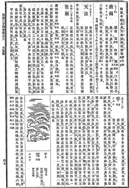 空から異物が降る話は古くから世界各地に伝わる。江戸期の百科事典『和漢三才図会』には、「怪雨」の項目がある。この本によれば草、魚、獣毛などが降った記録が中国にあるらしい。日本でも元禄15(1702)年の9月に綿が降った記録がある。