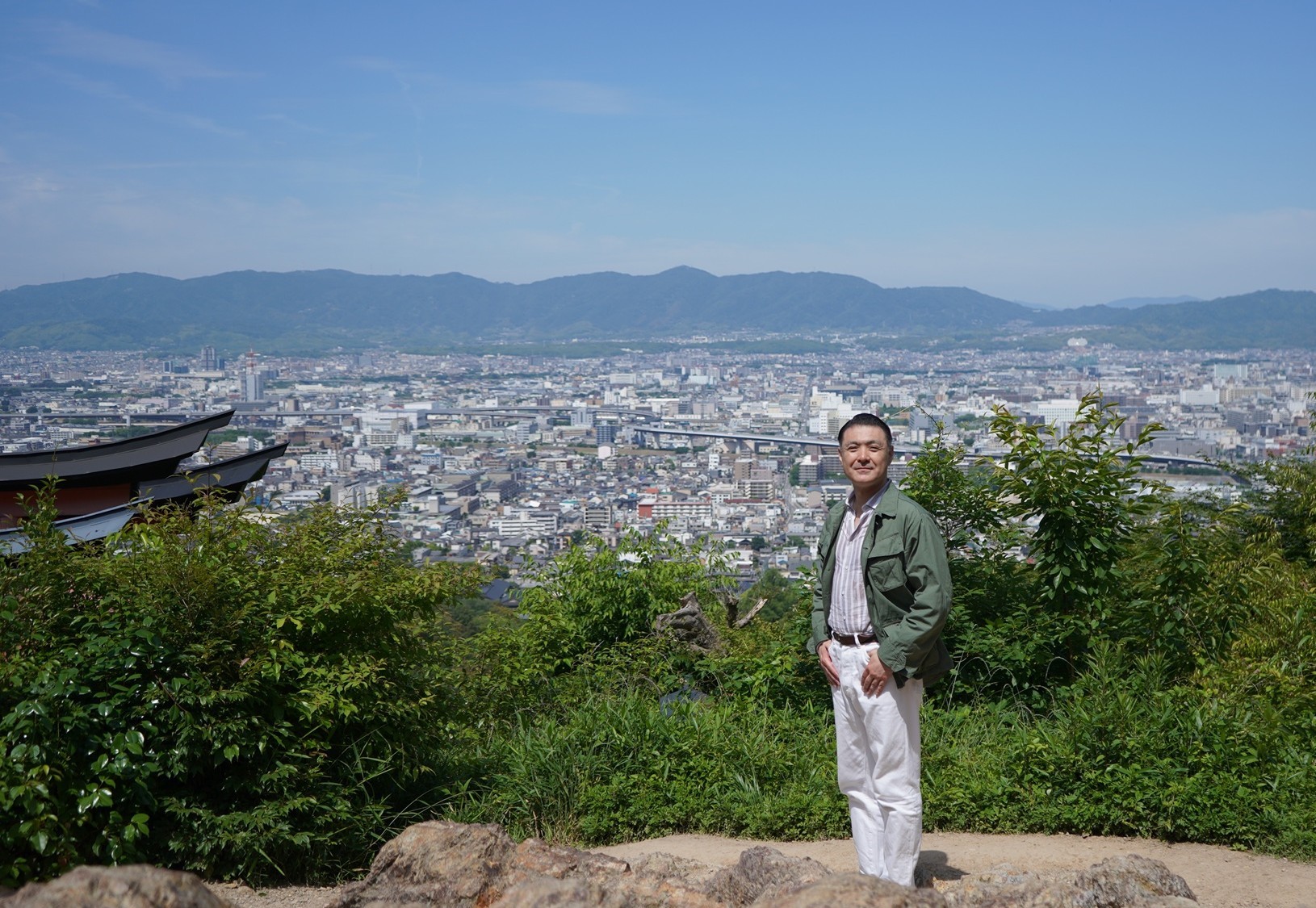 さらに登っていくと、見晴らしの良い広場に出ました。ここは「四ッ辻」と呼ばれていて、参道屈指の絶景スポットとして知られています。京都市内が一望できる風景を、他の参詣者たちも休憩をしながら眺めていました。織太夫さんが立たれた場所は、ゴツゴツとした盛り上がった岩があるのが印象的です。稲荷山の岩盤は主に砂や泥が固まった砂岩や泥岩で構成されているそうで、四ッ辻の岩はチャートと呼ばれる層状の堆積岩(たいせきがん)なのだと、神職に教えていただきました。