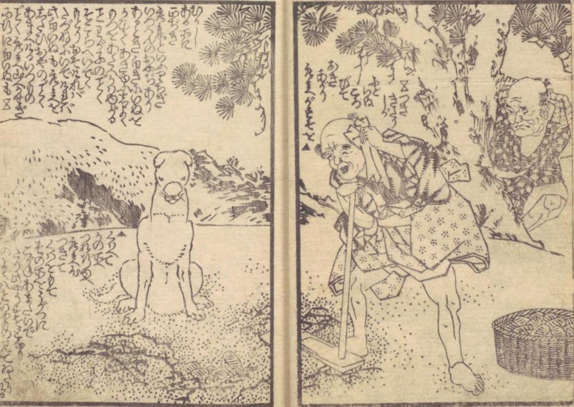 天から霊妙なる力を授かった特別な犬か、あるいは神の使いか。それとも育ての親への恩返しだろうか。これほどの手柄をたてたのだから、そこら辺を歩いているふつうの犬とは似ても似つかない。しまいには『花咲爺』の華麗なるフィナーレである。死んでなお、灰になり枯れ木に花を咲かせるという奇跡まで起こしてみせる。