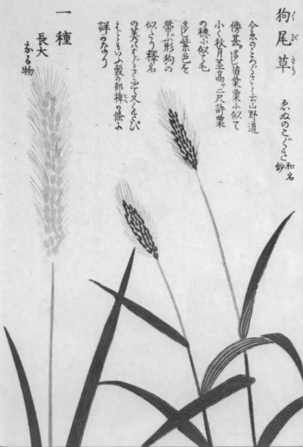 たしかに粟状の穂の形は犬の尾に見えなくもない、かもしれない。伝統的な薬物学を記した『本草網目』にも形が狗の尾に似ていることから狗尾と名付けられた、と書かれている。