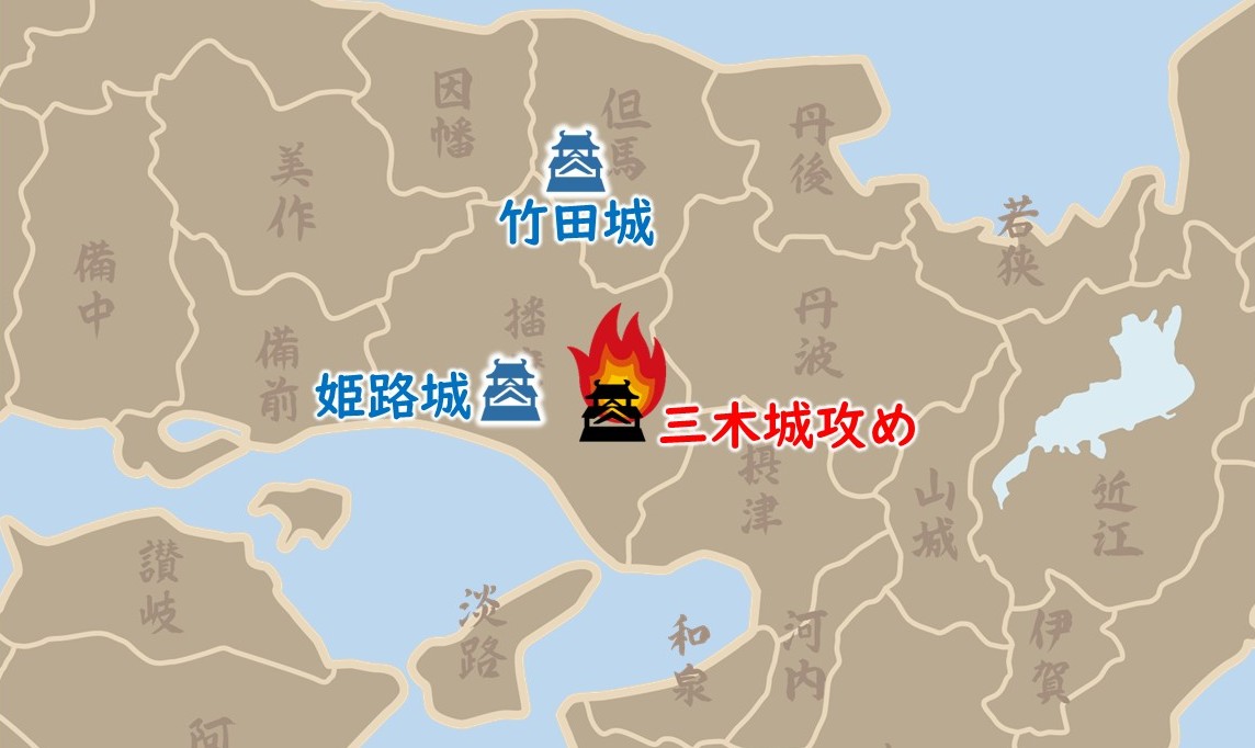 ところが翌年、織田に従うことでまとまったはずの播磨の地元勢力の大半が、離反する事態となります。秀吉は、地元勢力の中心である別所長治(べっしょながはる)の三木城を攻めますが、離反の背後には中国地方の覇者・毛利氏の存在もあり、予断を許さない状況でした。そんな中、離反しなかった黒田官兵衛に対し、秀吉は「わが弟の小一郎と同然に、心安く思う」と伝えています。秀吉が最も信頼するのが、小一郎であることがうかがえます。一方、但馬平定を進める小一郎に、信長は三木城攻めに加勢するよう命令。小一郎は但馬を宮部継潤に任せ、三木城攻めに加わりました。三木城を囲む陣には、蜂須賀正勝、前野長康、竹中半兵衛ら、旧知の面々の姿もあります。