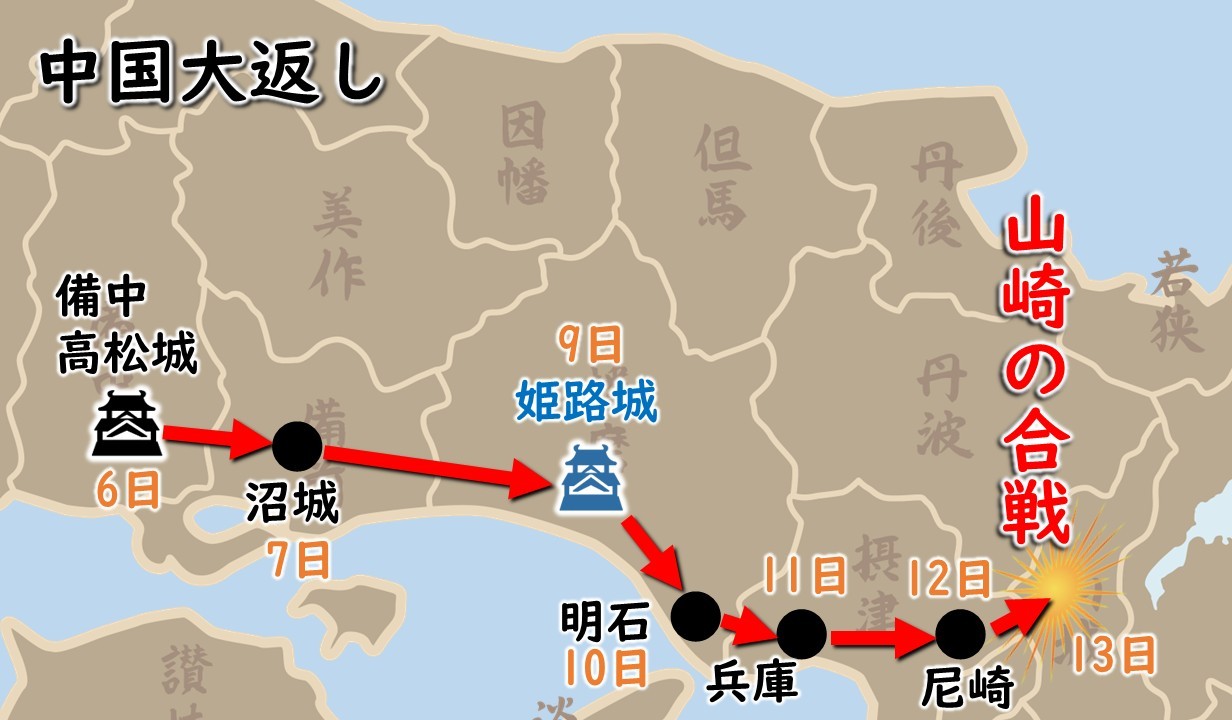 変事を6月4日に知った秀吉は、急ぎ毛利方と和睦すると、6日より山陽道を東へと駆け、姫路を経由して11日には尼崎に到着します。いわゆる「中国大返し」で、もちろん小一郎も一緒でした。秀吉の軍勢が山陽道を無事に通過できるよう、小一郎の家臣・羽田正治(はねだまさはる)が地元勢力に依頼した記録が残ります。13日、明智勢との山崎の戦いでは、黒田官兵衛らとともに小一郎の軍勢も奮戦し、勝利に貢献しました。光秀を討って、主君信長の仇をとった秀吉は、織田家中で最も強い発言力を持つことになり、同年の織田家の家督を決める「清須会議」を有利に進めます。