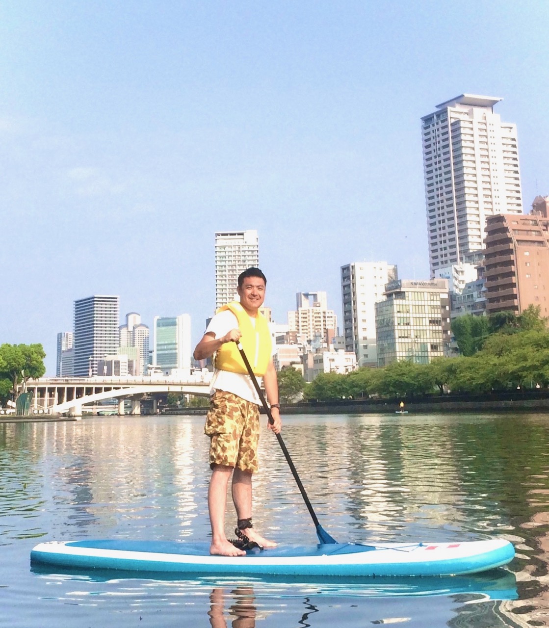 この大川は中州となっている「中之島」で、北の「堂島川」、南の「土佐堀川」と分かれて名前が変わるのも特徴。織太夫さんは、お祖父様の石町にあったマンションの向かいにある中之島エリアの八軒家浜で、後輩の小住太夫さんとSUP(スタンドアップパドル)を楽しんだこともあるそうです。9年前の写真を見せていただきました。ビルを背景にSUPを楽しむ姿は、さすが生粋の大阪人ですね。