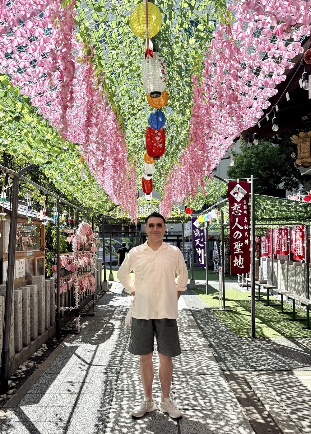 「時の鐘」から車移動15分ほどで「お初天神」に到着。お初と徳兵衛は、この社の裏にあった天神の森で心中事件を起こしました。まさしく近松門左衛門の『曾根崎心中』誕生の地と言えます。正式名称は「露天神社(つゆのてんじんじゃ)」ですが、お初の名前にちなんだ「お初天神」の通称がよく知られています。JR「大阪駅」・各線「梅田駅」、大阪メトロ谷町線「東梅田駅」、から近い便利な場所にあることから、旅行客の姿も多く見られます。