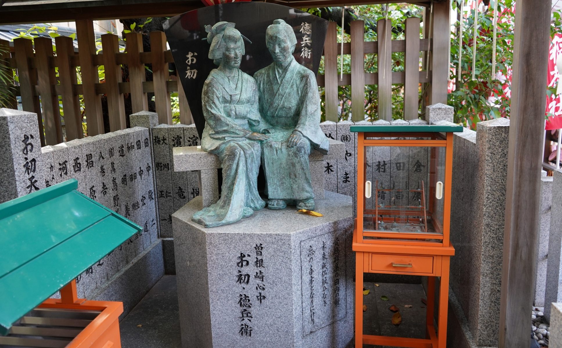 2人の三百回忌の慰霊祭の際、氏子の1人から「お初さんのために」と百万円の寄付があり、それをきっかけに地元商店街などからの寄付金で建立された慰霊ブロンズ像がありました。恋の成就を願うパワースポットとして訪れる人も多く、この銅像の前で祈願すると、2人の悲しい恋物語にあやかって願いが叶うとされています。