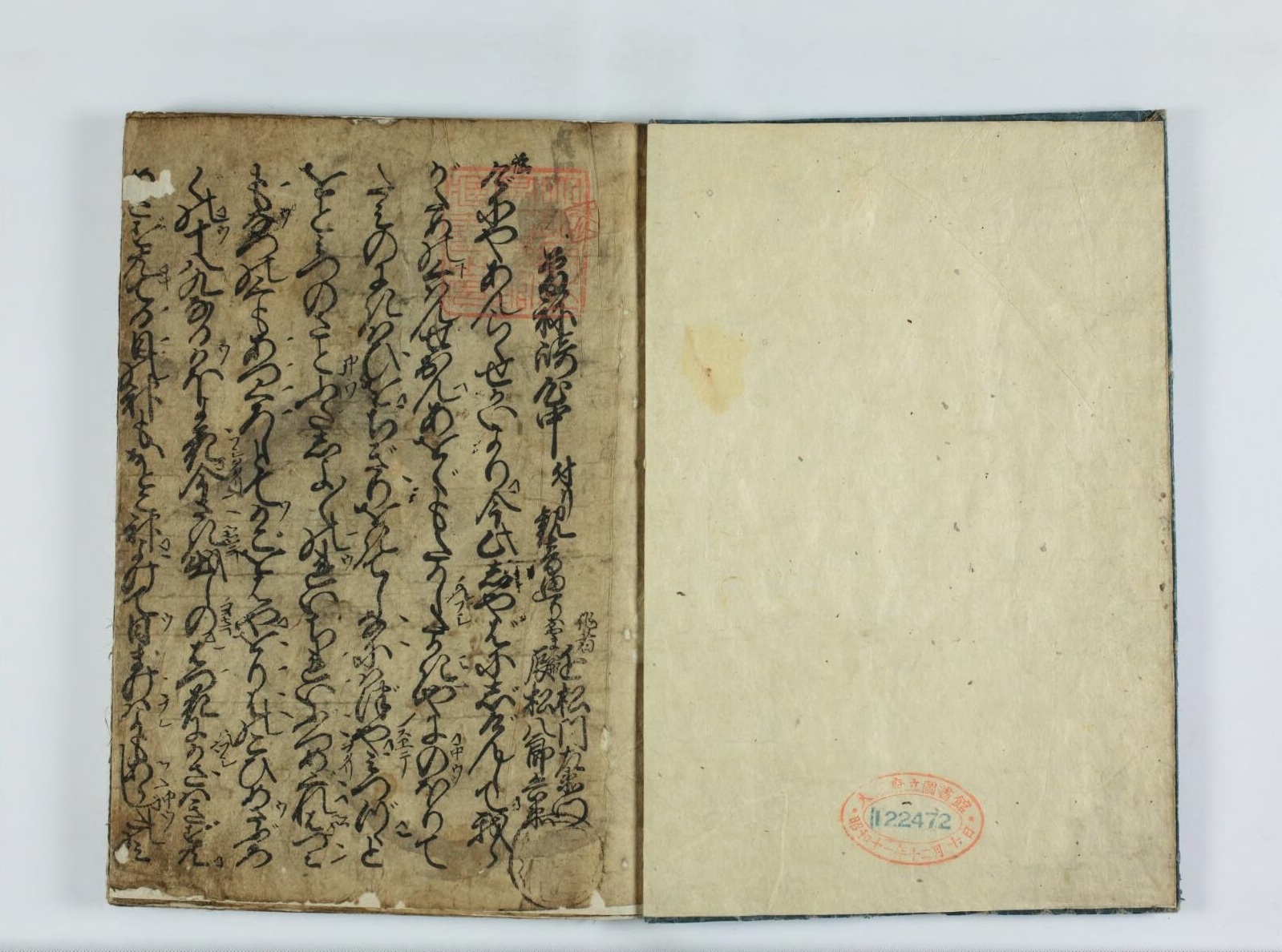 大阪府立中之島図書館には『曾根崎心中』の浄瑠璃本が所蔵されています。破損しているページがあり、奥付(おくづけ)を欠いていたため、いつ出版されたものなのか長らく不明でした。それが平成15(2003)年に富山県の黒部で完本が見つかったことから照らし合わせ、元禄16(1703)年に刊行された初版正本(しょはんしょうほん)だということが確定したそうです。