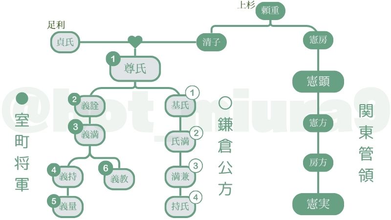 初代鎌倉公方は義詮の弟・基氏(もとうじ)で、室町将軍とも良好な関係を築いてたんだが……。それぞれの子・孫世代になると、だんだん室町将軍と鎌倉公方の仲が悪くなってきてなぁ……。代々関東管領を務めた上杉氏は板挟みとなる。