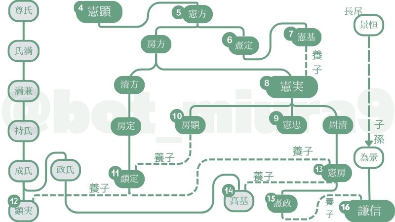 しかし越後守護をしていた筋が室町後期に断絶してしまったので、本家と一本化する。そして憲実のひ孫にあたる憲政(のりまさ)は、家臣の長尾為景(ながお ためかげ)の息子・景虎(かげとら)を養子に取った。