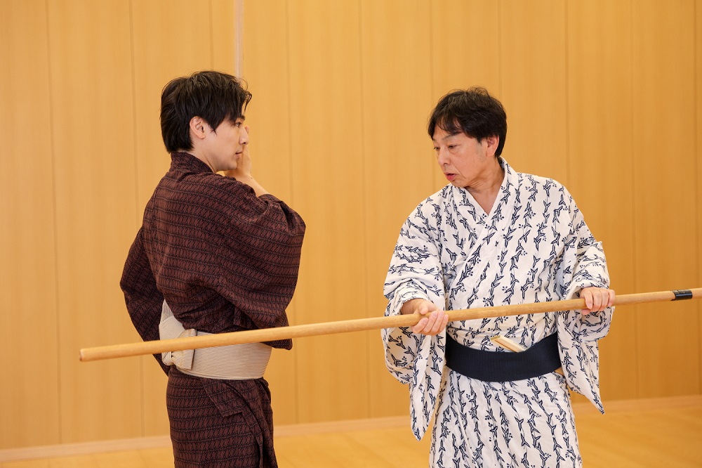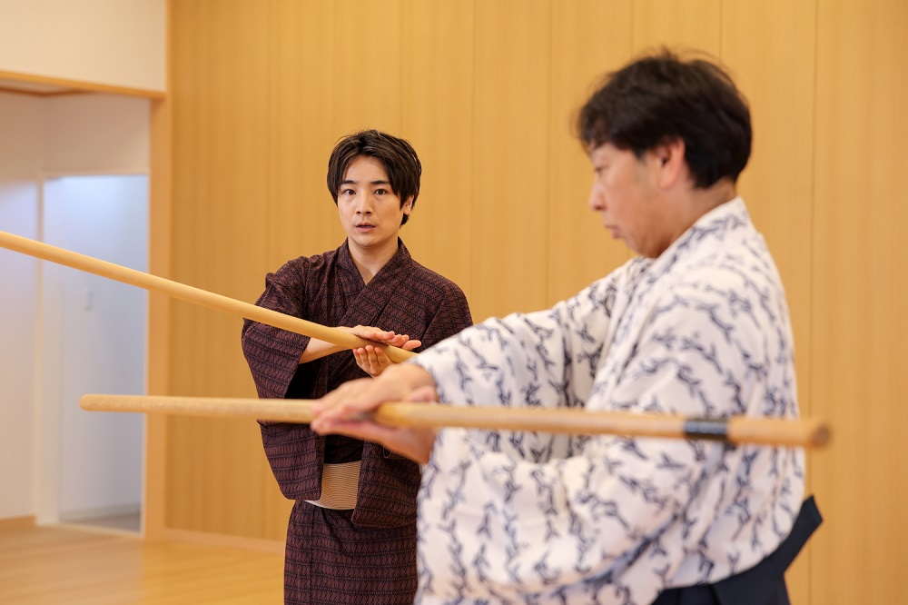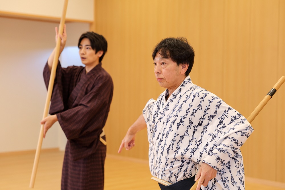そんな立廻りを今回は少しだけですが、猿四郎さんに手ほどきいただきました。主役を引き立てる役が使う“搦み(からみ)”と言われる棒の使い方を、懇切丁寧にレクチャーいただいたのですが、棒を手足同然に使えるようになるまでの道のりの遠さを実感。シンプルながら、奥深い技術に気付けば汗だくになりました。
