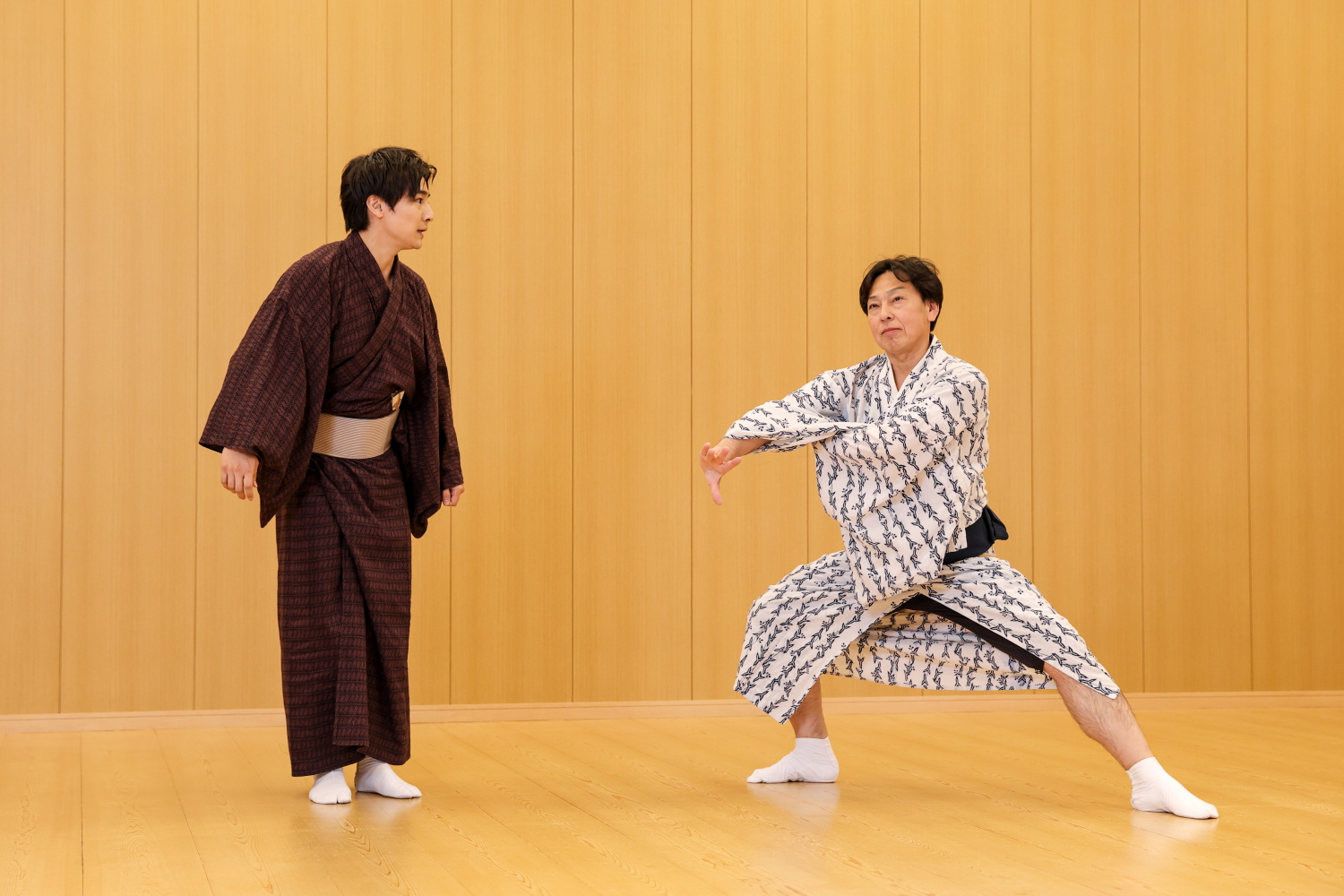まず第一に感じたことは、猿四郎さんのお手本があまりにもかっこいい! 何といっても体の芯がビシッと通っていて、力強さとキレがあるだけでなく、色気をも感じさせる洗練された動きです。僕も何とか食らいつこうと頑張ってみますが、鏡を見て猿四郎さんの姿に近付こうとすればするほど、今まで感じたことのない筋肉の負担と稼働を感じます。猿四郎さんが事もなげに見せてくださる動きは、想像よりもずっとハード。足を大きく開く、膝を外に向ける、肘を張る、骨盤を立てる……。しんどさの要因は色々ありますが、これらのどれか一つでもサボってしまうと、一気に格好悪くなるのです。歌舞伎の格好良さの源は、そのハードな身体操作ひとつひとつにも宿っているということがよくわかりました。