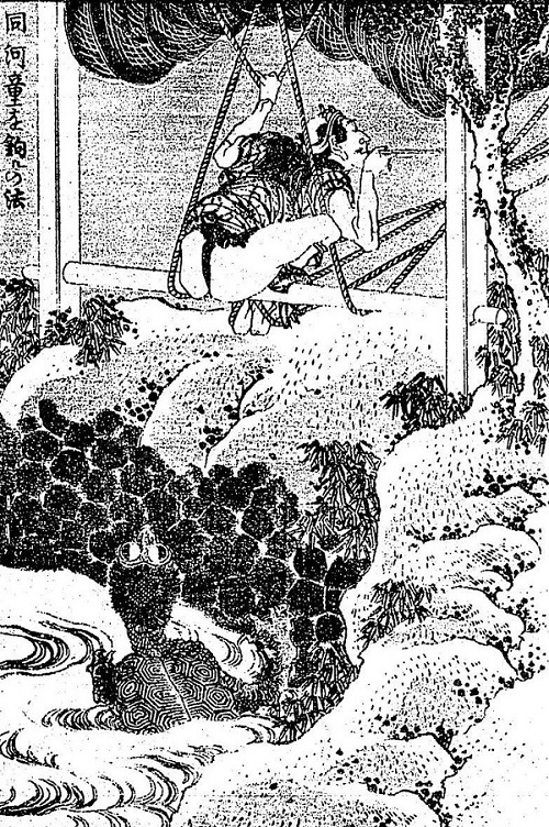 A man sticks out his bottom to try and fish for a Kappa, whose favourite food is the mythical Shirikodama (尻子玉). From Hokusai Manga, Vol. 12 (National Diet Library Digital Collection)