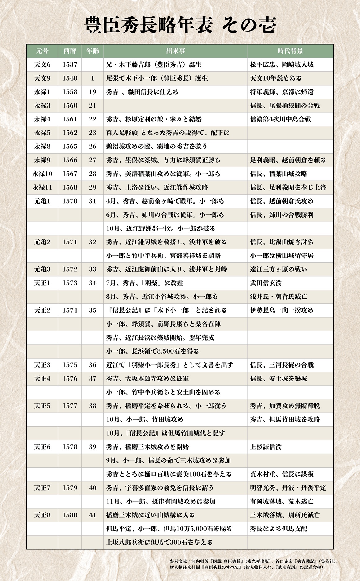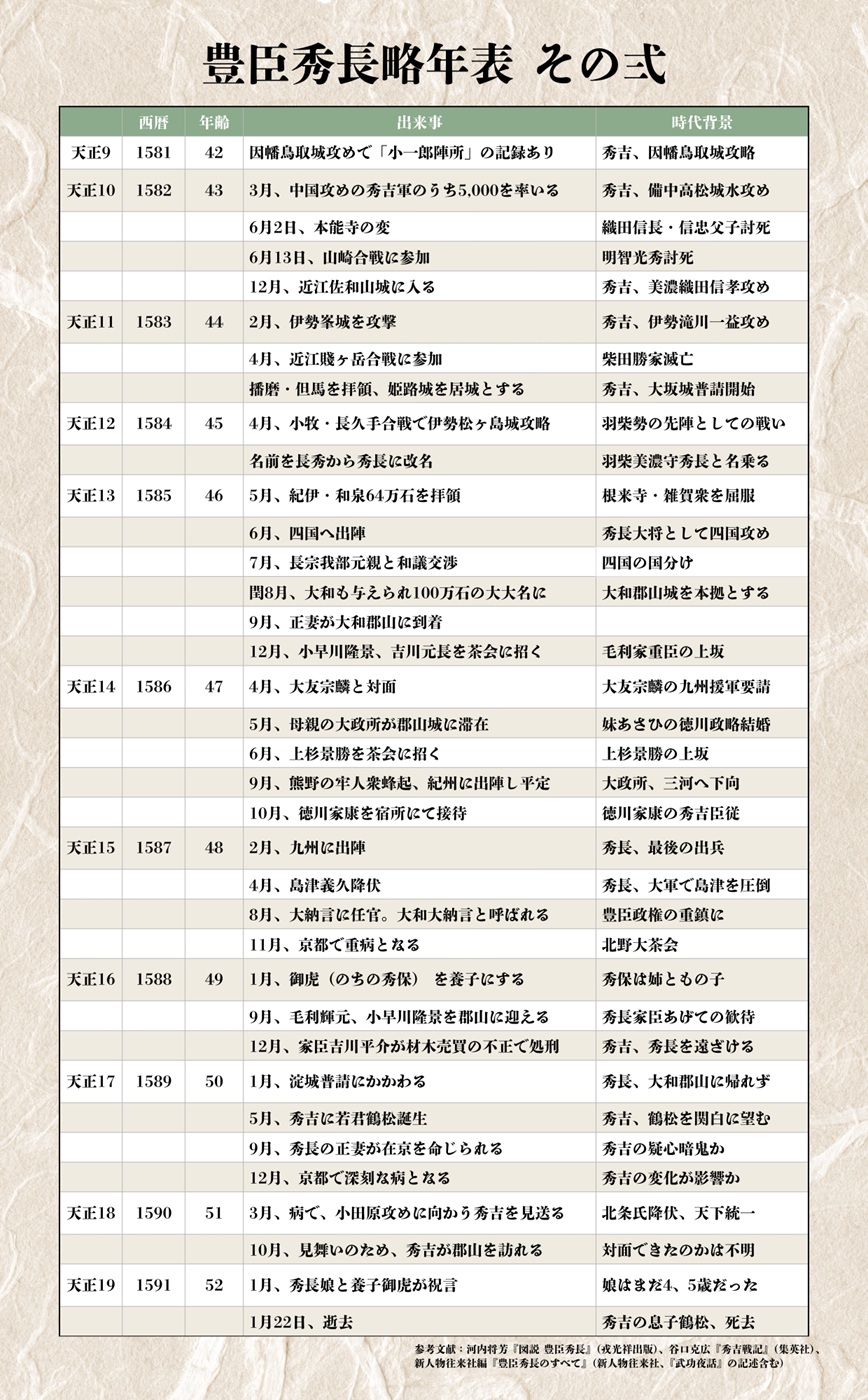 もっとも、戦国時代に農民に生まれた秀吉や秀長の若い頃は、同時代の記録がなく、秀長が初めて良質な史料に登場するのは、35歳のときです。それ以前の出来事については、後の時代に書かれたものを参考にせざるを得ません。年表も35歳までは、前野家文書の『武功夜話(ぶこうやわ)』や『太閤記』など、江戸時代に書かれたものも参考にして作成しています。