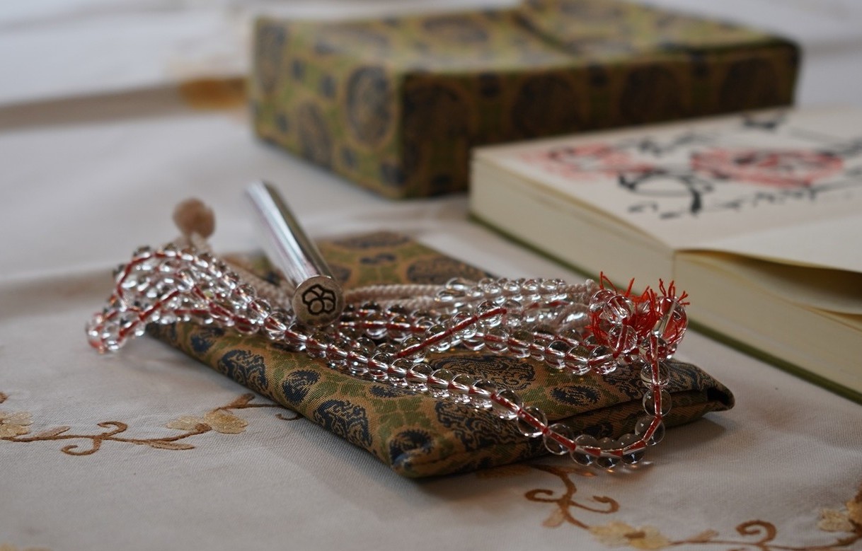 今年最初の御朱印は、こちらの壷阪寺になりました。カバーと御朱印帳ケース、信玄袋、数珠入れは、龍村美術織物の「高山寺龍文(こうざんじりゅうもん)」の文様で揃えておられます。京都の清課堂で別誂えされた銀製の香筒(こうづつ)に近づいて見てみると、本名の坪井家と鶴澤(つるさわ)家の家紋である中陰蔦(ちゅうかげつた)が入っていました!
