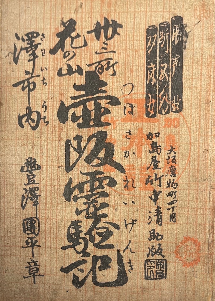 その後明治20(1889)年2月彦六座ー今の難波神社の境内にありました。ちなみに文楽座も難波神社の境内が発祥で碑が立っていますーで上演された『三拾三所花野山』『沢市内の段』が現在文楽で上演されている『壺坂』となったものです。この時にこの段を勤めたのが三代目竹本大隅太夫(たけもとおおすみだゆう)と初代豊澤團平(とよざわだんぺい)です。作は團平の妻お千賀(加古千賀)で、五行本(ごぎょうぼん)※4も出版されました。