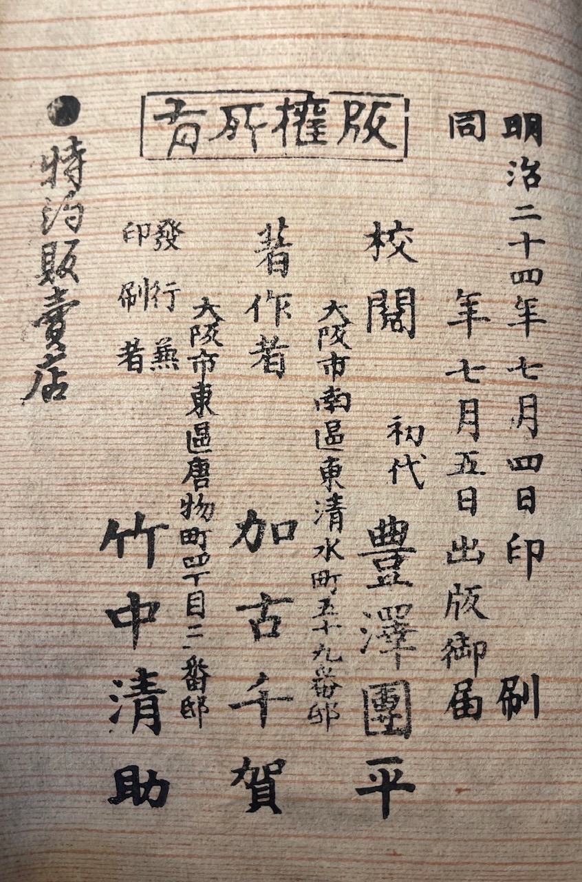 裏返すと明治24(1891)年の出版だとわかります。初演後から4年後ということになりますね。