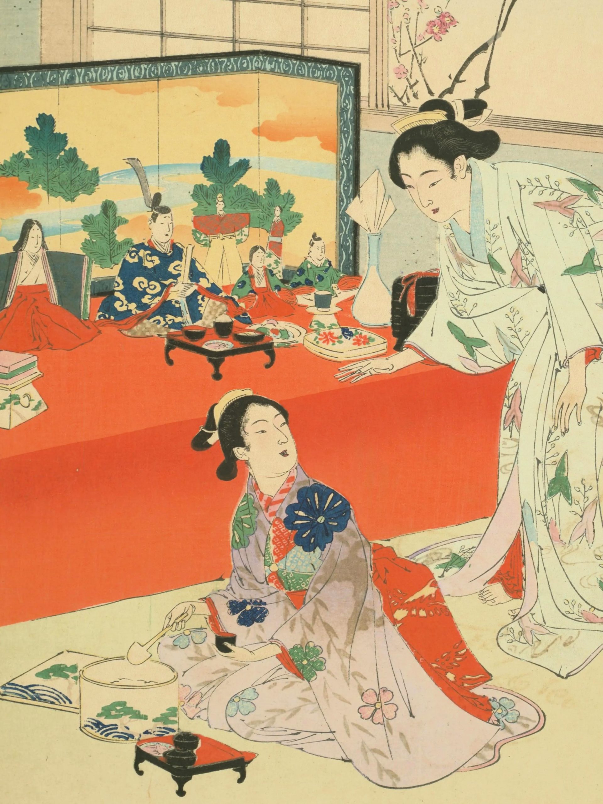 飾り方にも注目を。当時の風俗を描いた浮世絵などを見ると、内裏雛がいくつも並んでいたり、市松人形も並んでいたりして、とても賑やかです。江戸時代には雛人形の飾り方に特に決まりはなく、思い思いに飾って楽しんでいたことがわかります。