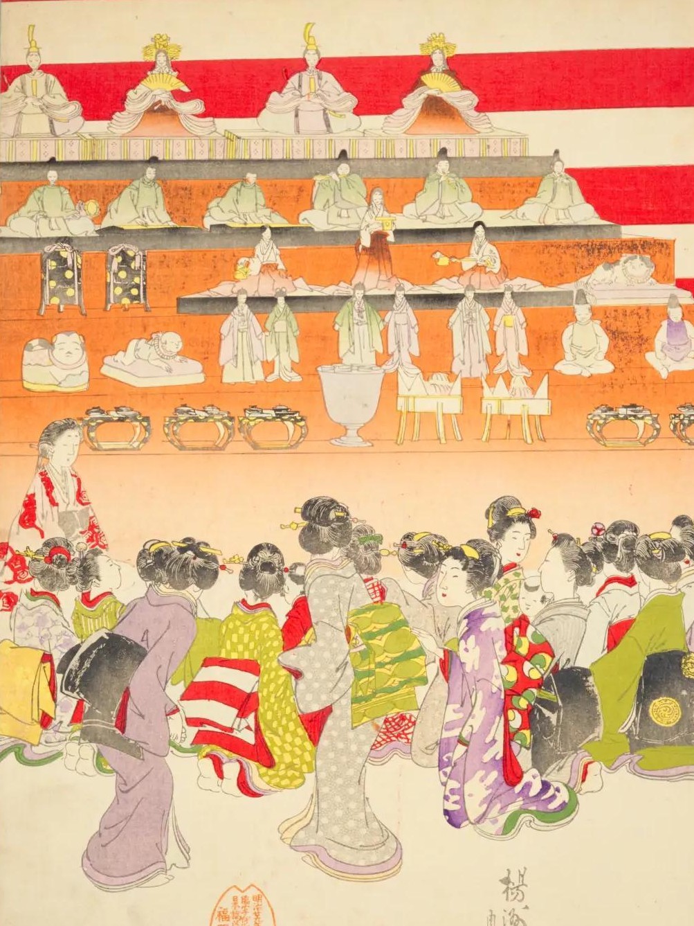 江戸時代に、3月3日の「上巳の節句」が五節句のひとつとして祝日に制定されたことをきっかけに、人形を飾って女の子の成長を祝うお祭りとして庶民にまで広まりました。