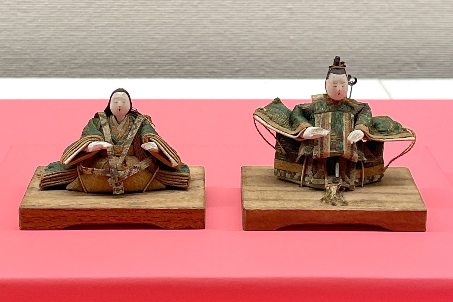 こちらが、ケシの実のように小さいことから「芥子雛」と呼ばれていた、江戸時代のミニチュアお雛さま。上の写真の芥子雛は、わずか4~5㎝の大きさながら、面長のお顔、袖が横に張った男雛の衣装、十二単の五衣(いつつぎぬ)・唐衣(からぎぬ)に似た女雛の衣装など、江戸時代に流行した享保雛の特徴が細部までしっかりと表現されています。