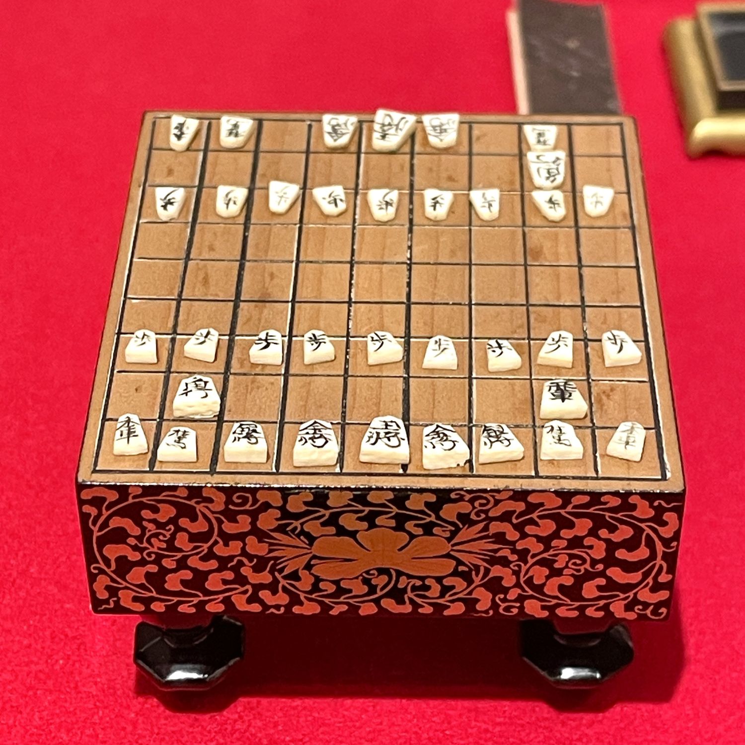 こちらの将棋盤は3.2㎝、小さな駒もひとつひとつ丁寧に作られています。「歩」は縦3㎜×横2.5mm!