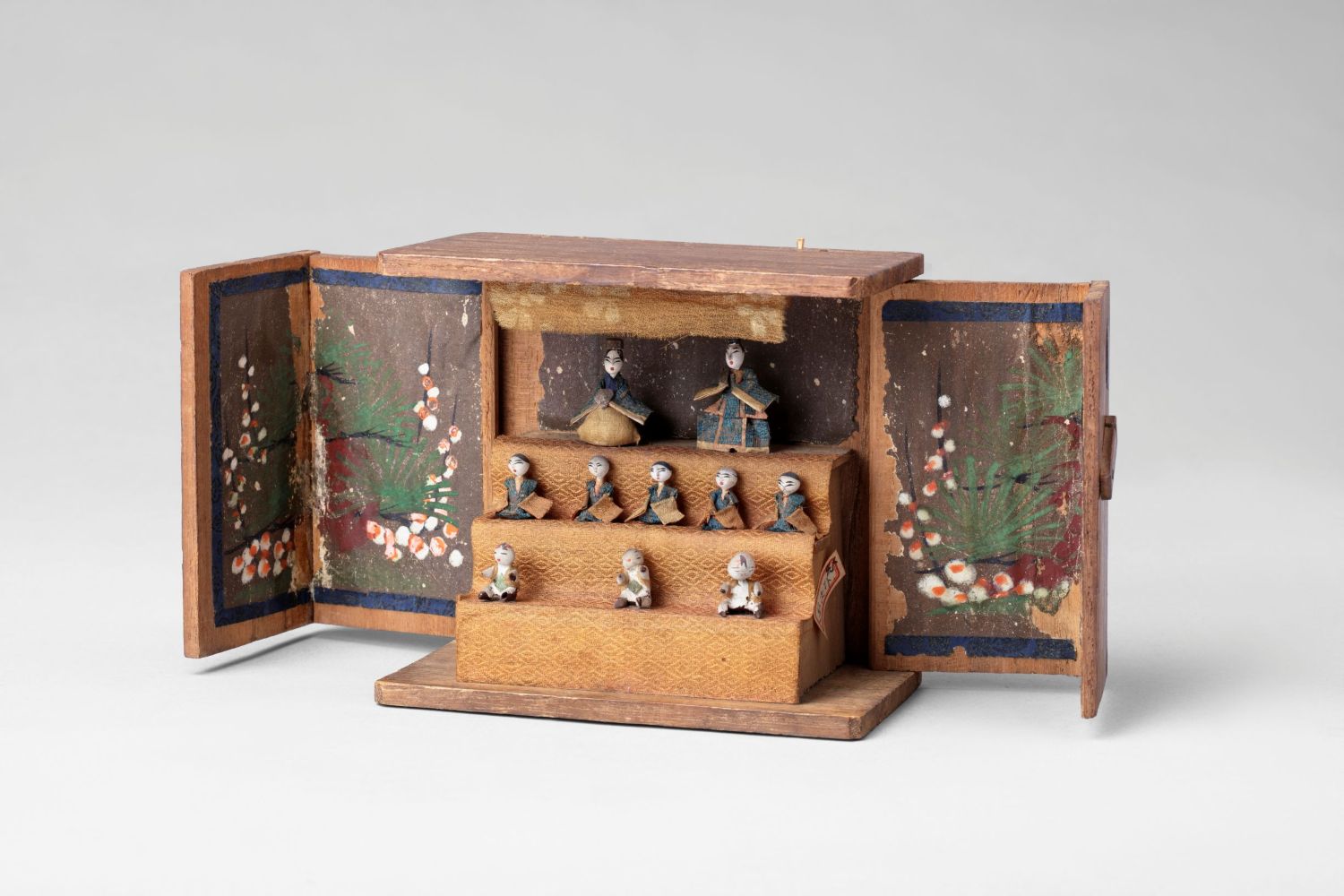 こちらは岩槻のお隣、越谷(こしがや)で作られた庶民向けと思われるお雛様。11.9㎝の小さな桐箱の中に、指の先ほどの男雛と女雛、五人囃子などがおさめられています。