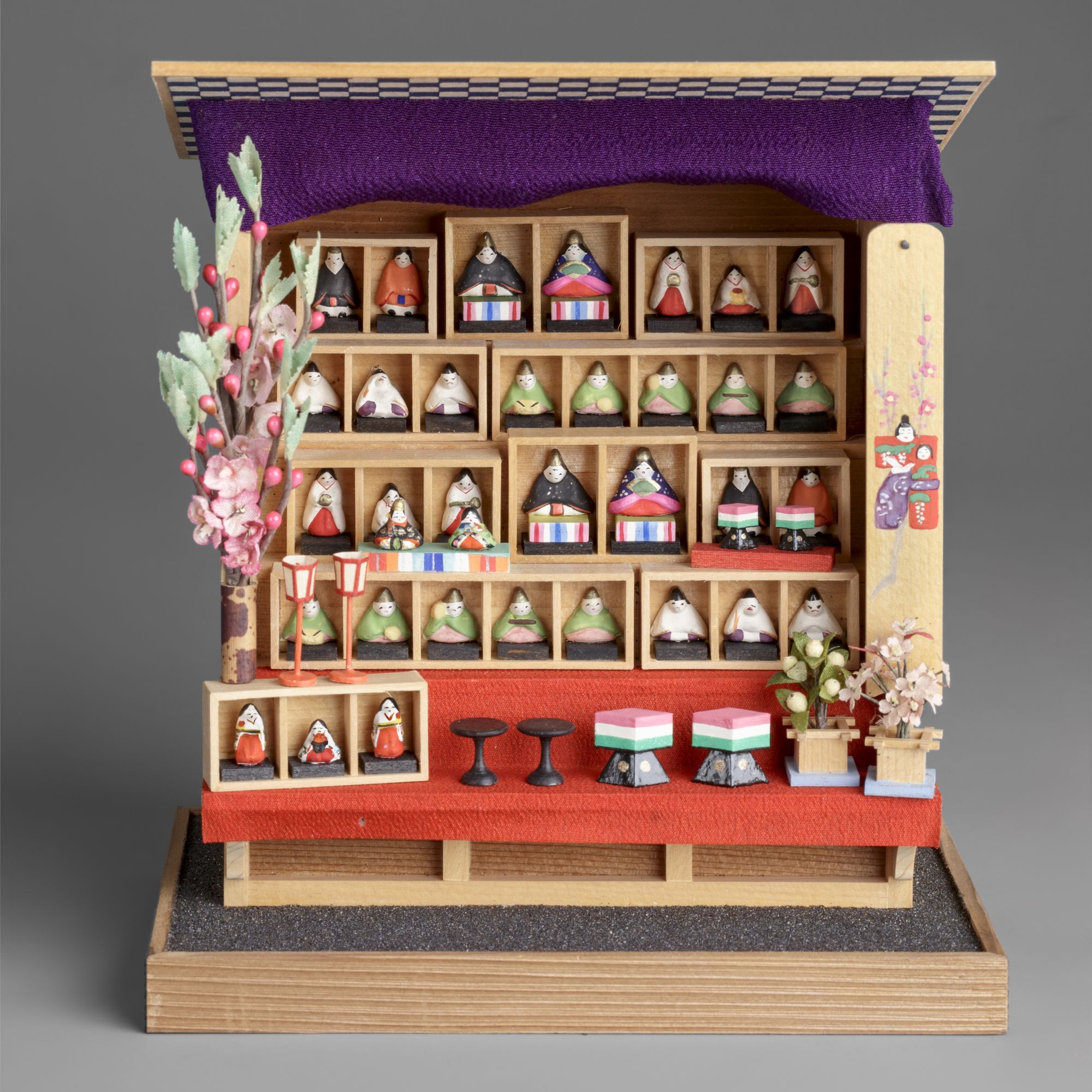 町人文化が花開いた江戸時代、人々は豪華な雛人形を見せ合い、競い合ったそう。客の求めに応じて雛人形はどんどん大きく、豪華になっていき、江戸時代の後期になると五人囃子や三人官女など人形の種類も増えて、5段飾り、7段飾りと雛段も高くなっていきました。宮中で働く女性をモデルにした三人官女は京で生まれ、能の謡とお囃子をモデルにした五人囃子は、特に江戸で好まれていたのだとか。