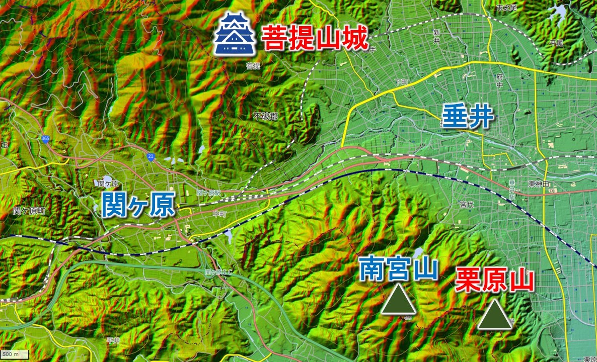 菩提山城と栗原山の位置関係(国土地理院地図を加工)