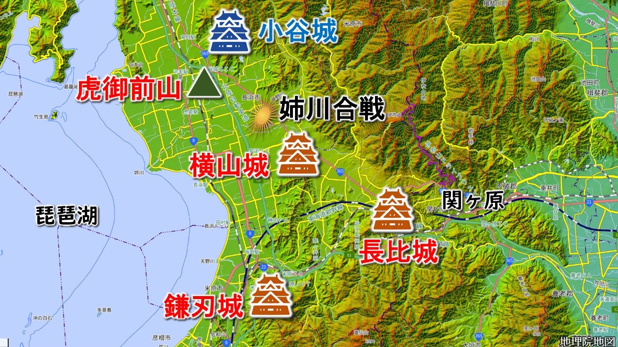 元亀元年6月初め頃、半兵衛は浅井方の長比(たけくらべ)城(米原市柏原)を訪ねます。長比城は信長と敵対した浅井長政が、備えとして美濃との国境に新たに築いた城でした。城将は浅井家家臣堀秀村(ほりひでむら)の家老、樋口直房(ひぐちなおふさ)。信長に仕える半兵衛にとって敵方の城ですが、樋口とは旧知の仲でした。一説に半兵衛が浅井の客分となった際、住居を世話したのが樋口だったといいます。半兵衛は樋口を説得して味方につけることに成功、さらに樋口の主君である堀秀村の鎌刃(かまは)城(米原市番場)をともに訪れ、秀村の同意も得ました。長比城、鎌刃城はどちらも中山道を押さえ、浅井領の南端に位置する城です。両城の堀秀村、樋口直房が織田方についたことで、信長は浅井攻めの足がかりを確保しました。半兵衛の功績です。