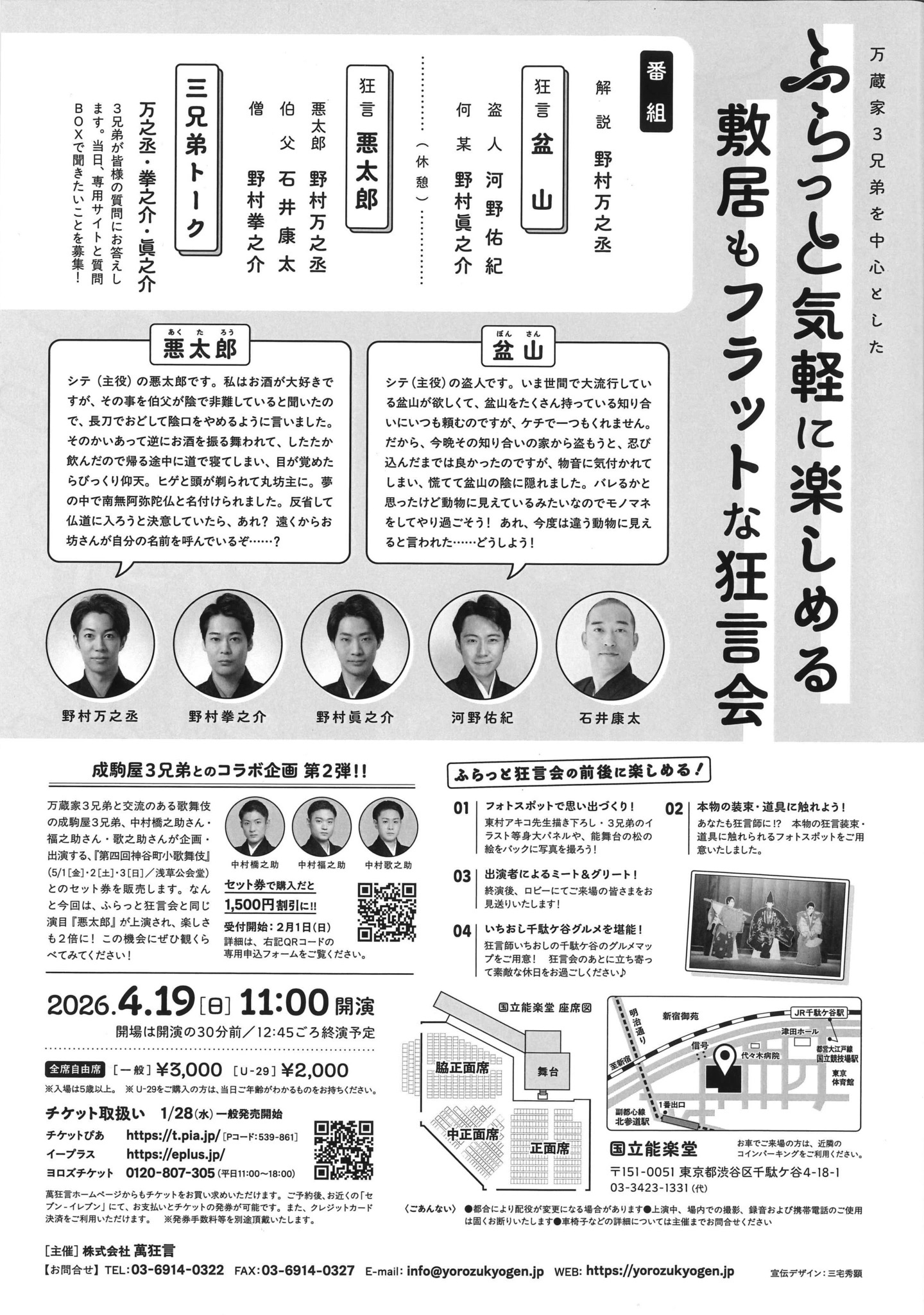 「悪太郎」は、万蔵家三兄弟と交流のある歌舞伎の成駒屋、中村橋之助さん、福之助さん、歌之助さんたちが企画する『第四回神谷町小歌舞伎』(5/1~3:浅草公会堂)でも上演される予定で、三兄弟コラボ企画としてセット券販売もします。