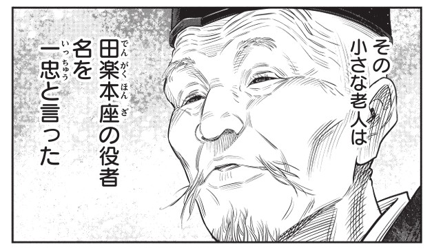 ▲世阿弥のライバル、田楽の増次郎。こちらも実在人物をもとに作られたキャラクター