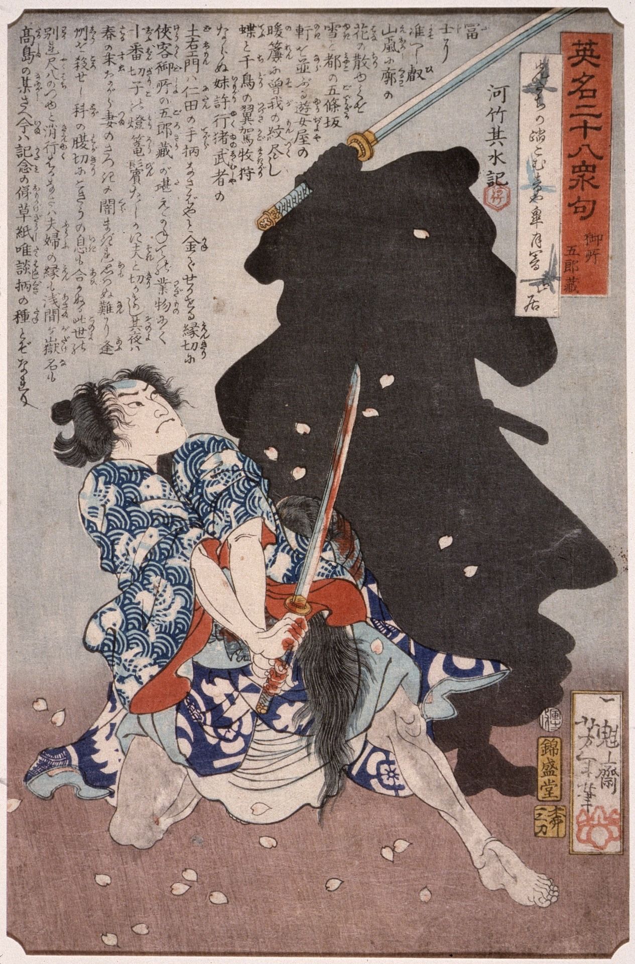 正月名物であった曽我狂言も、幕末にはすっかり飽きられて来て、代わりに流行したのが従来の約束事をパロディにした趣向です。夜の「御所五郎蔵」がまさにそれで、タイトルに「曽我綉」と銘打つように、主人公の侠客御所五郎蔵の名は、曽我五郎を抱き留めた御所五郎丸に由来していますし、五條坂での星影土右衛門との出逢いのセリフでも「抜き身のふったその晩は、しかも五月二十八日」と、富士の狩場での兄弟本懐の日を織り込んでいます。