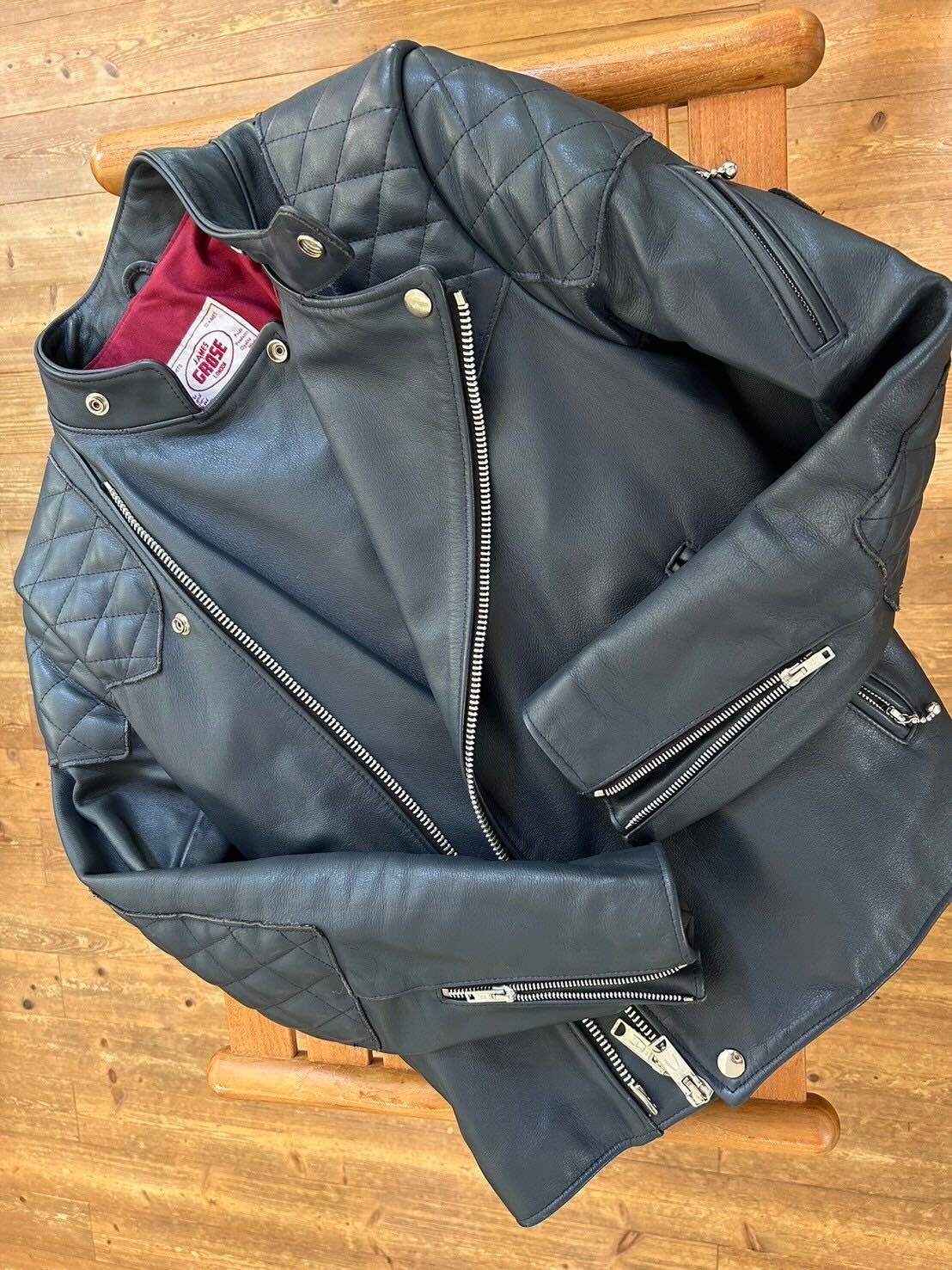 本気のバイク乗りのためのブランド“JAMES GROSE”のライダースジャケトは、カウハイドレザー(生後2年までの、出産を経験したメス牛の革)で、とにかく重い!しかもピッタピタのジャストサイズでつくったため、動きづらい!電車のつり革もつかめません!