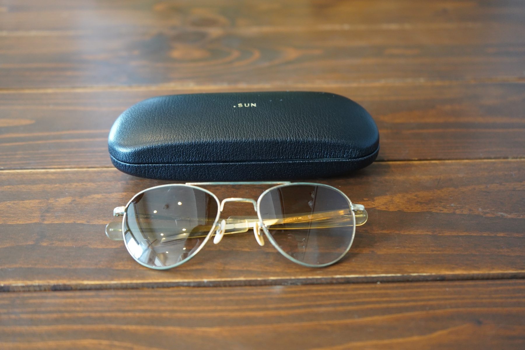 そしてさらにこのサングラスですよ。妙にサイズが小さいな、と思ったらそれもそのはず。これはパイロットがヘルメットを装着したままかけられるミニマルサイズのパイロットグラス。つまりは超上空での臨戦体制、命のやり取りをする時のサングラスです。「American optical」の‘50年代のヴィンテージアイテムで、ティアドロップの元祖としてマニアの間では有名。現代のティアドロップよりレンズがコンパクトにできていて、テンプル(つる)がまっすぐで厚みがないのが特徴です。どうやらレンズも当時のガラスのまま使用している模様です。