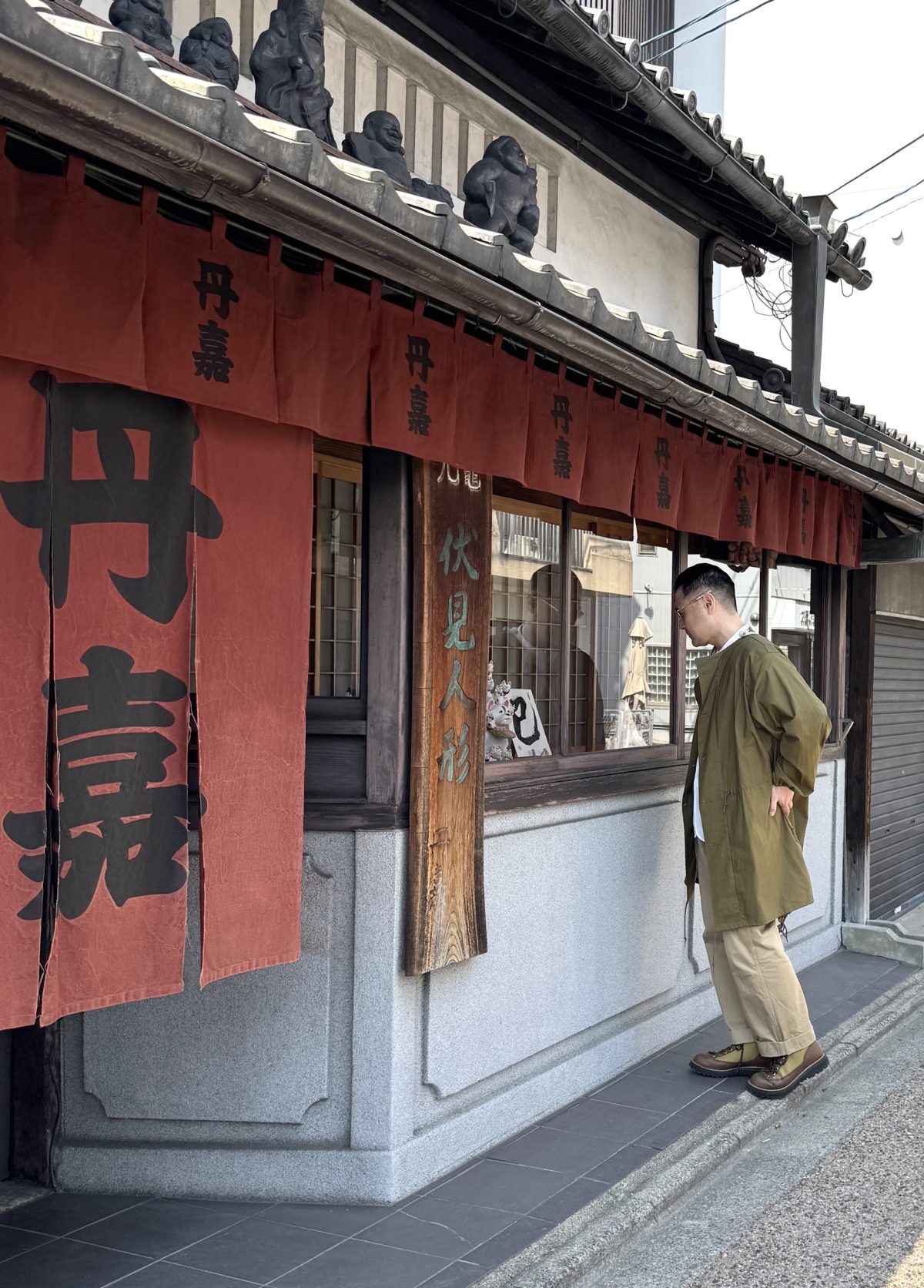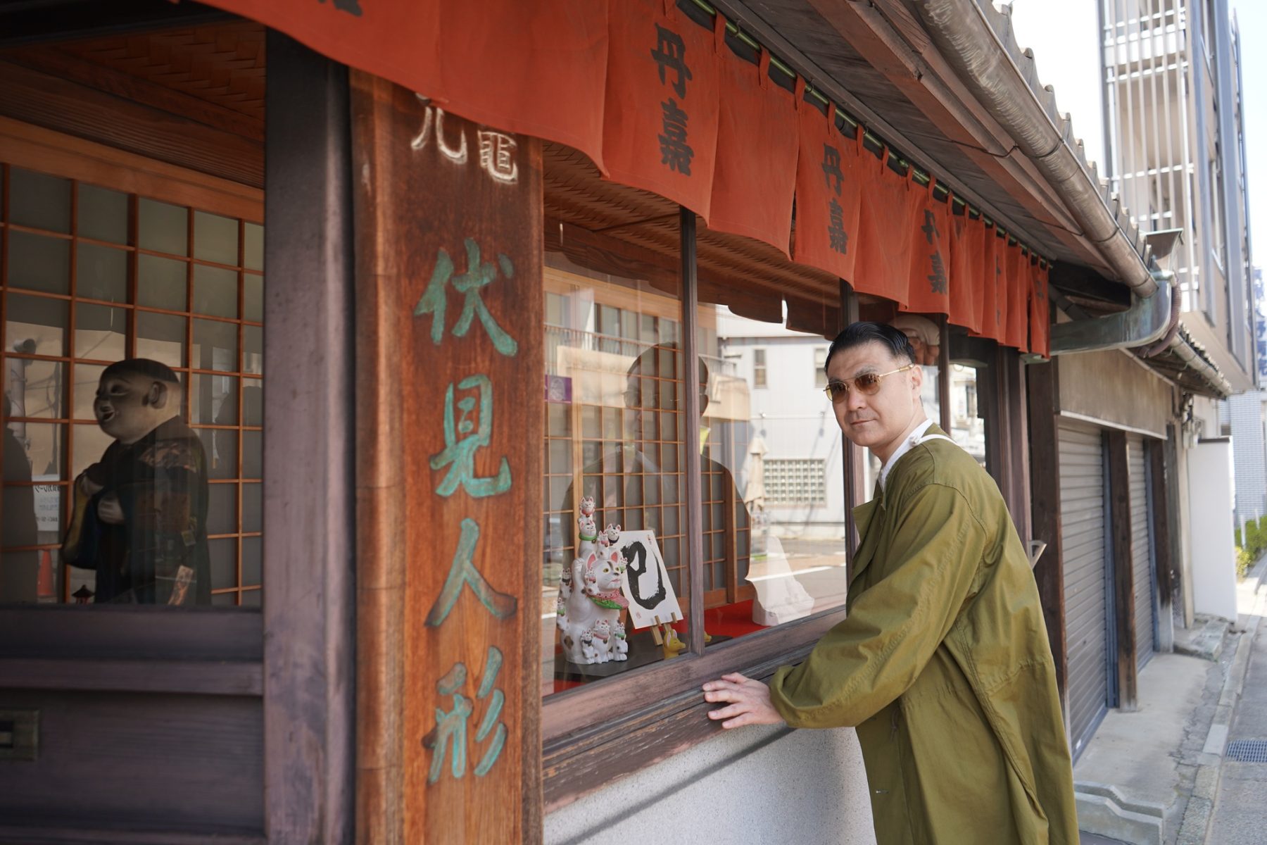 観光名所としても人気の高い伏見稲荷大社周辺には、老舗和菓子店や、話題の人気店などが並んでいます。織太夫さんがふと足を止めたのは、趣のある店構えのお店。歴史を感じる風情と、ショーウインドウに飾られた人形が気になったようです。