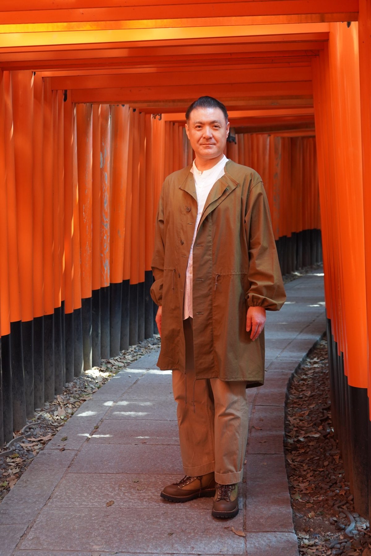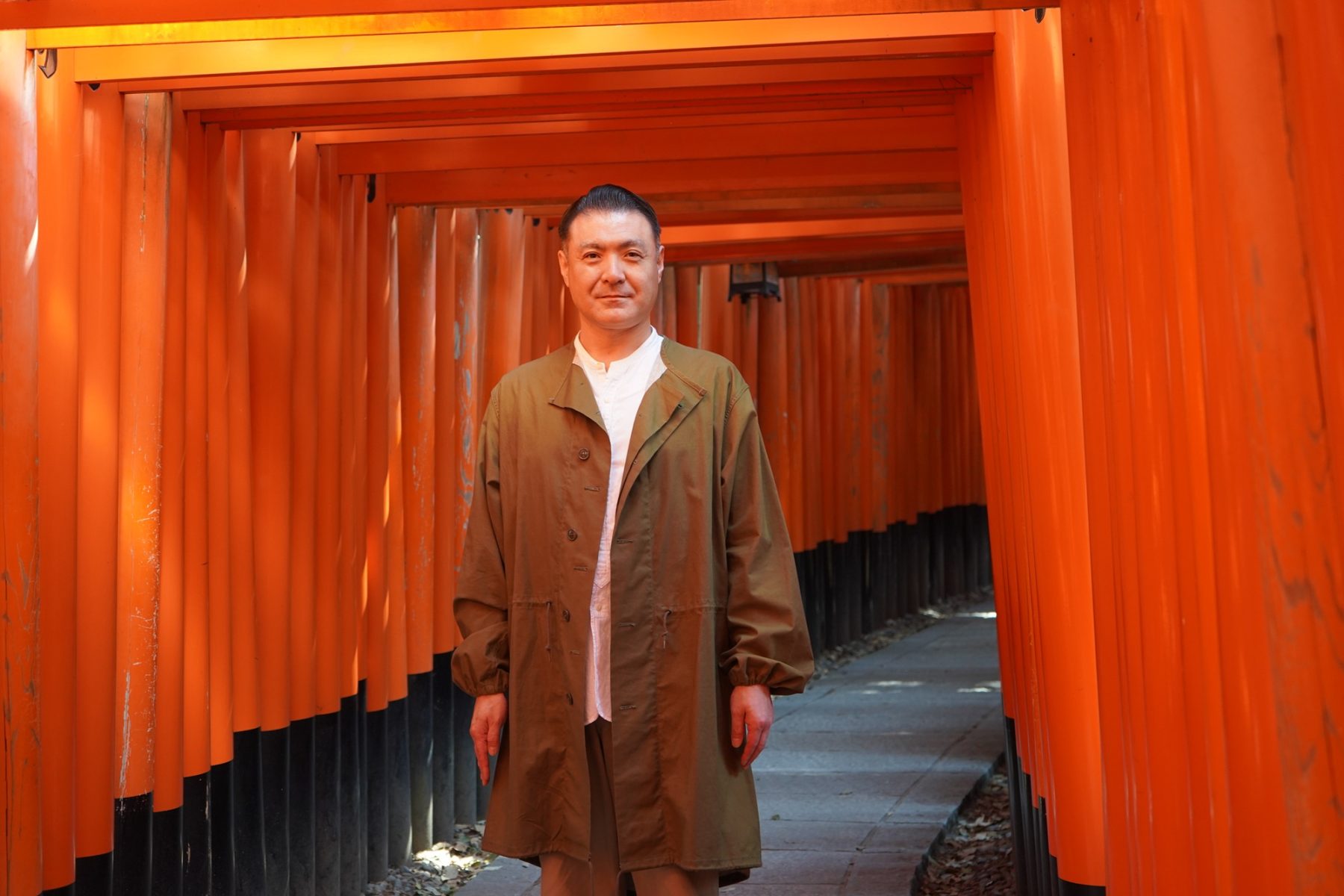 千本鳥居をバックに、織太夫さんを撮影させていただきました。鳥居の鮮やかな赤と、インナーの白シャツとのコントラストが美しいです。