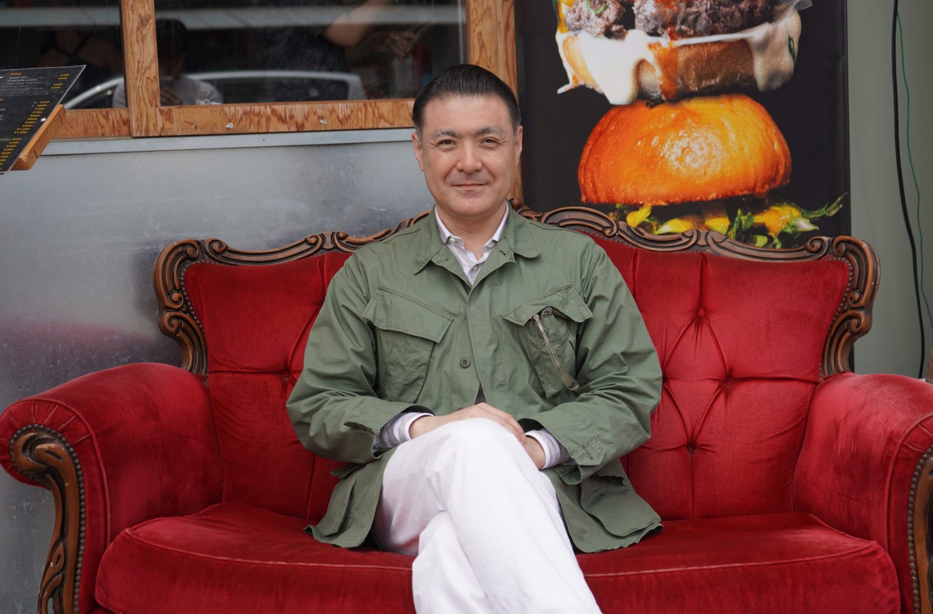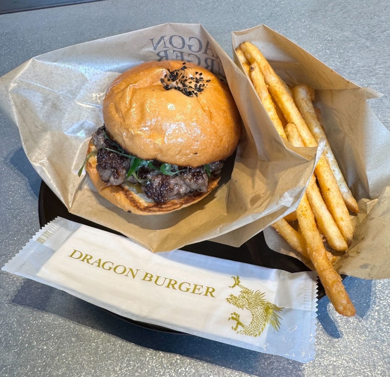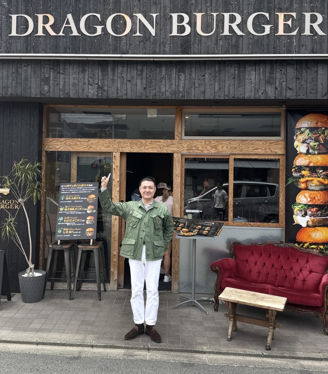 次に織太夫さんが案内して下さったのが、『ドラゴンバーガー伏見稲荷店』。スタイリッシュな外観の店先に、貴族が腰掛けるようなゴージャスなソファーが置かれていて、先ほどのお店から急に雰囲気が変わります。海外からの観光客が多く、どこか異国へ紛れ込んだような…。