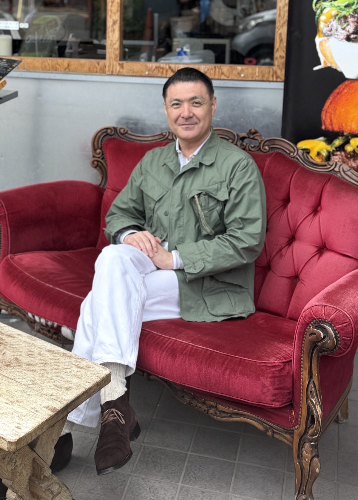 オリ(織)ーブカラーが夏らしいこちらの逸品は、素材感がとても涼しげ。それもそのはず、このジャケットは1964年、米軍がヴェトナム戦争に軍事介入、現地の高温多湿な気候に合わせて開発された「ジャングルファティーグ」と呼ばれる戦闘服なのです。戦闘服としての正式名称は「コンバットトロピカル」。初期は薄手のコットンポプリンを使用、我らが太夫が着用しておりますジャングルファティーグはフォース! つまり四代目で、素材は軽くて動きやすく、水に濡れてもすぐ乾き、ジャングルの中でも木の枝やナイフに引き裂かれにくいリップストップに素材変更されたものを着用。
