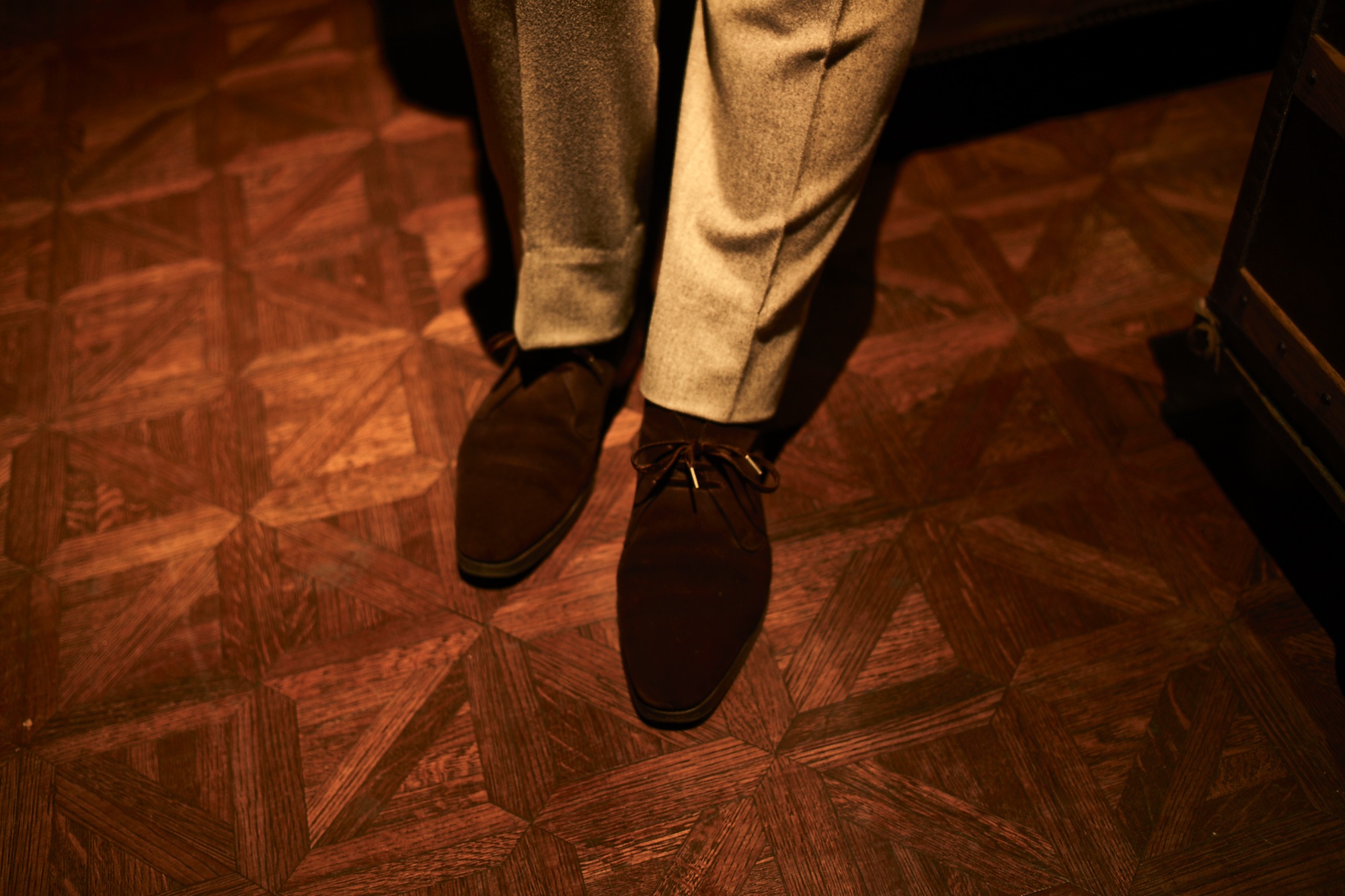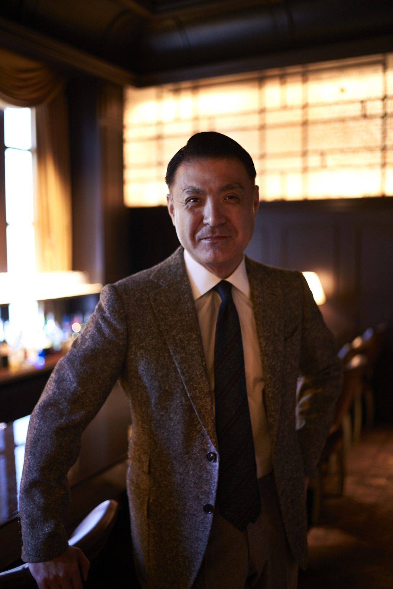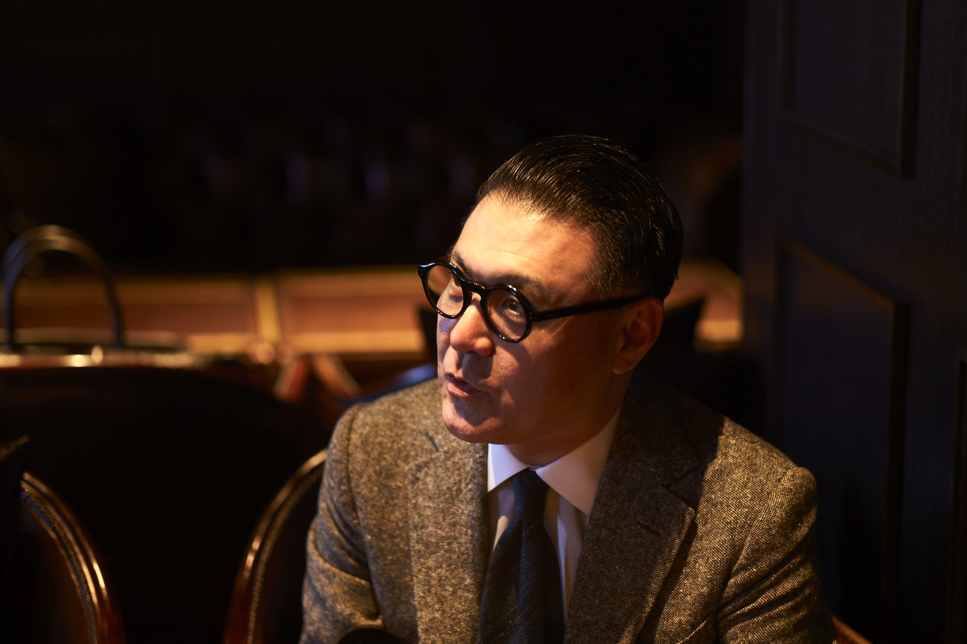 ちなみに一般の男性であればツイードジャケットにはツイードのパンツを合わせます。素材感の重さのバランスを考えるからです。ところが太夫の感覚は、「バランスをとらなきゃ」とか「変に見えないように」とか「ルールを守れば安心」などというレベルとは全く違う世界で鋭く深く研ぎ澄まされています。ただ興味深いのは、世界でも類を見ないほどに磨き上げられた織さまのオーセンティックな着こなしが、時として「遠目には、いたって普通」と見えること。